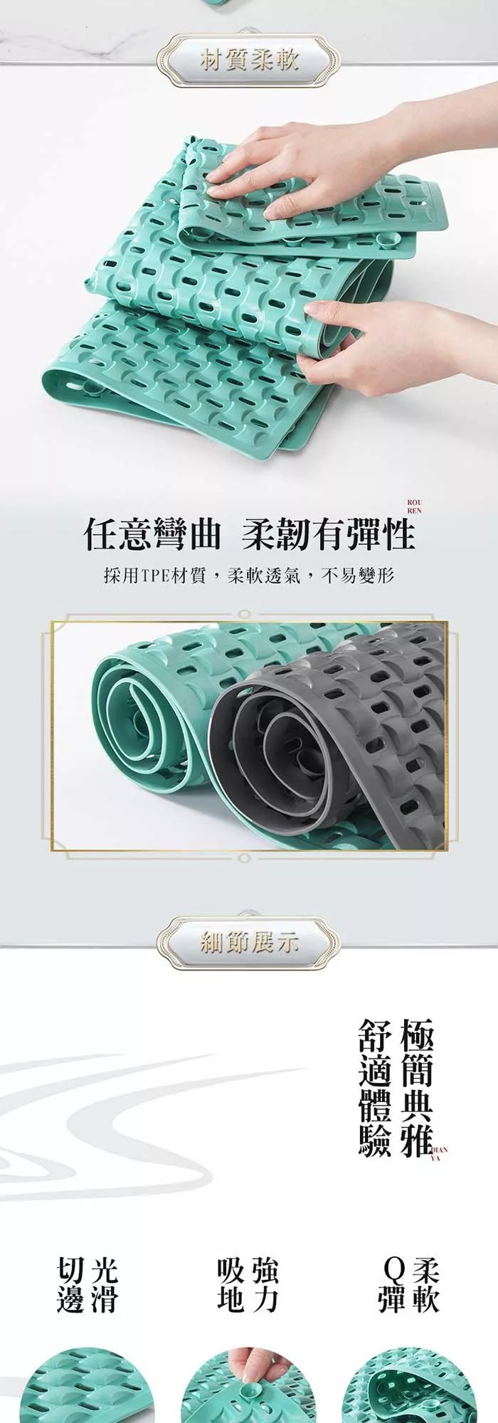 精細磨砂表面,柔韌且有彈性,隨意摺疊彎曲!不絡腳,不粘發,不發黴,舒適腳感,不懼肥皂泡。