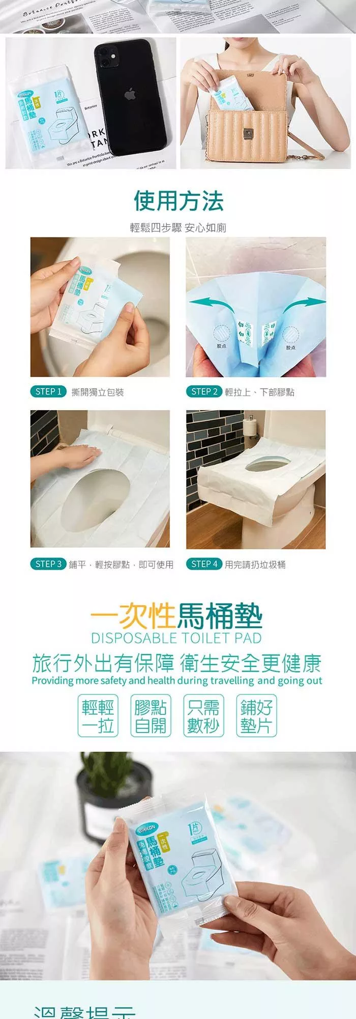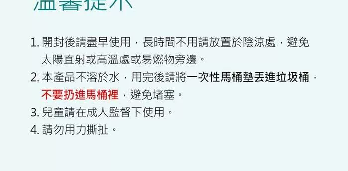 2.本產品不溶於水,用完後請將一次性馬桶墊丟進垃圾桶,不要扔進馬桶裡,不要扔進馬桶裡,不要扔進馬桶裡,避免堵塞。