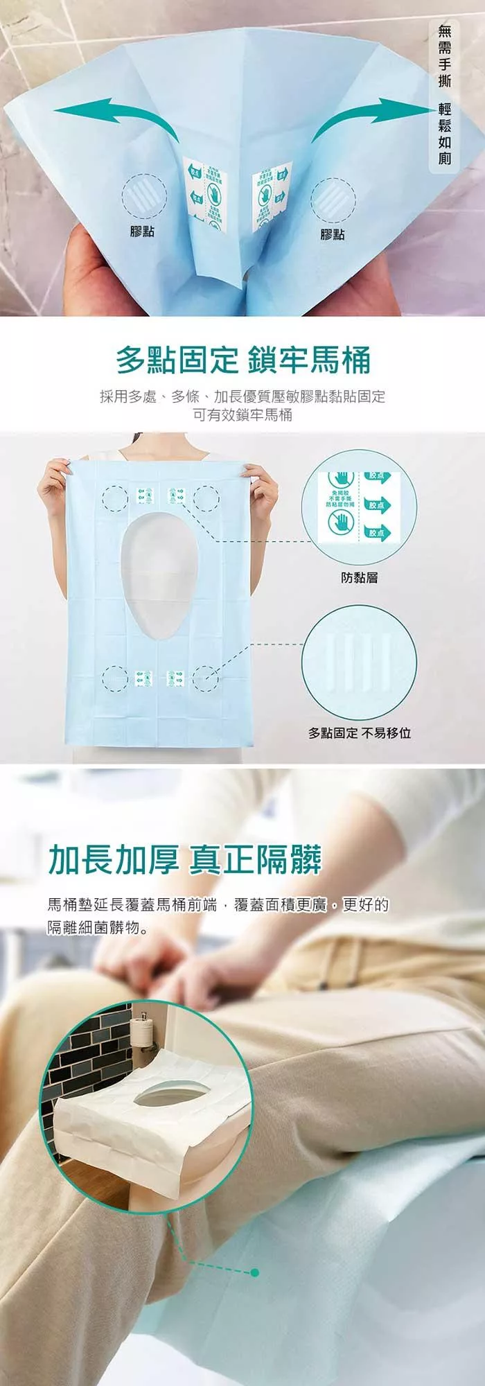 新款免揭膠包裝每片背面都帶12個壓敏膠點,展開即用方便快捷,避免二次污染,背面防水PE膜防水隔離髒污,12個膠點有效鎖牢馬桶,使用不打滑。
