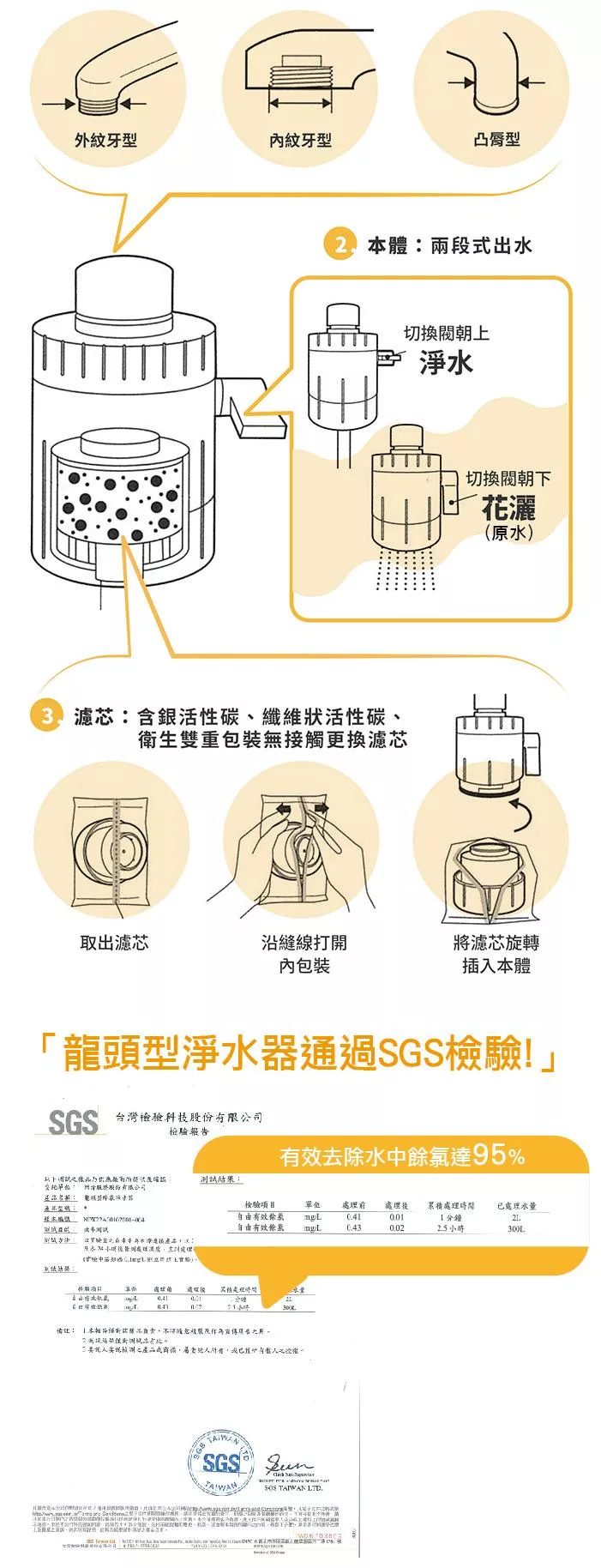 去除率95%(*本公司「龍頭型除氯淨水器」產品送至SGS測試,報告編號為NPX22A00102。)