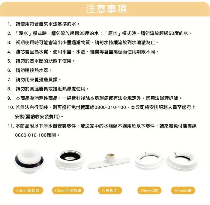 7.本商品附以下淨水器安裝零件,若您家中的水龍頭不適用於以下零件,請來電詢問。