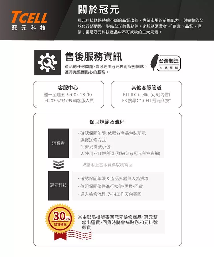 家電或3C商品涉及技術及專業,其保固及維修相關事宜仍應由該商品之原廠、代理商、製造商等進行專業之處置。若商品有保固及維修之需求,請依循原廠、代理商、製造商揭示之相應規範及流程處置,並配合提供產品序號和購買證明後依其指示進行。以商品瑕疵為由退換貨者,可代為受理將商品送原廠或代理商檢測(一般處理時間需2~3週,實際依各該品牌規範為準),若經檢測非商品本身瑕疵,恐無法退換貨。APPLE系列商品請見 APPLE系列說明。
