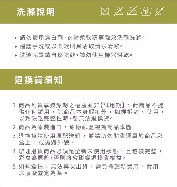 3. 退換貨請使用原配送箱,並請切勿貼貨運單於商品包裝上,或撕毀外貌。