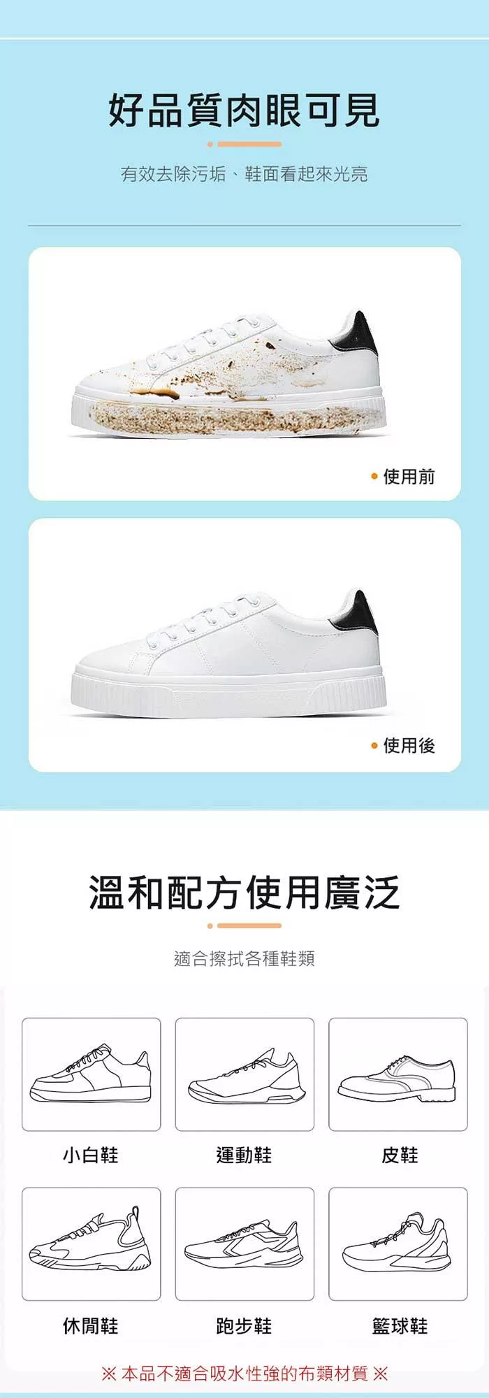 適用範圍:各類小白鞋、皮鞋、運動鞋的清潔護理(不適合吸水性強的布類材質)