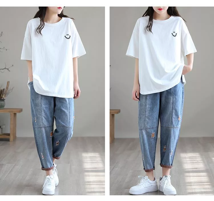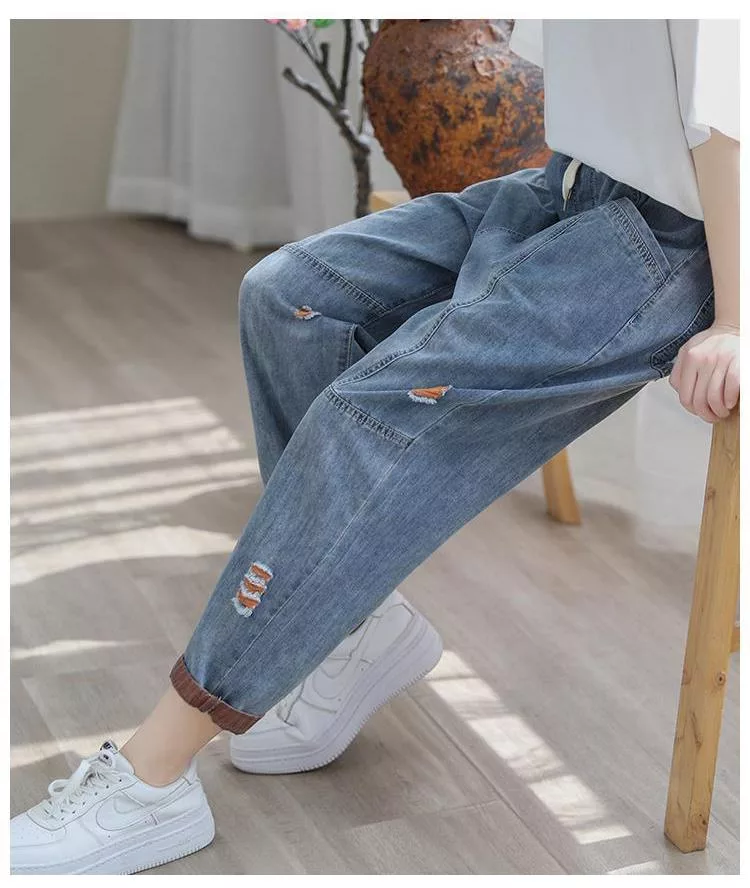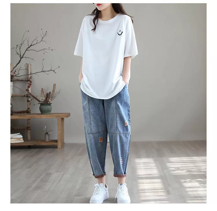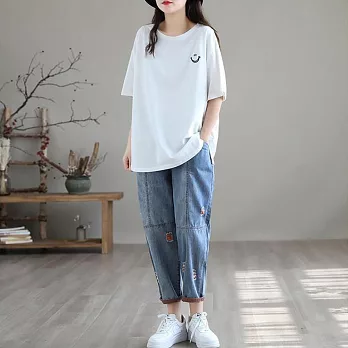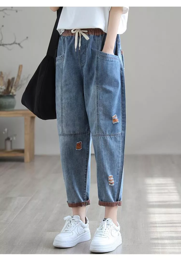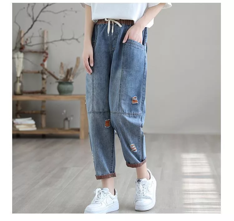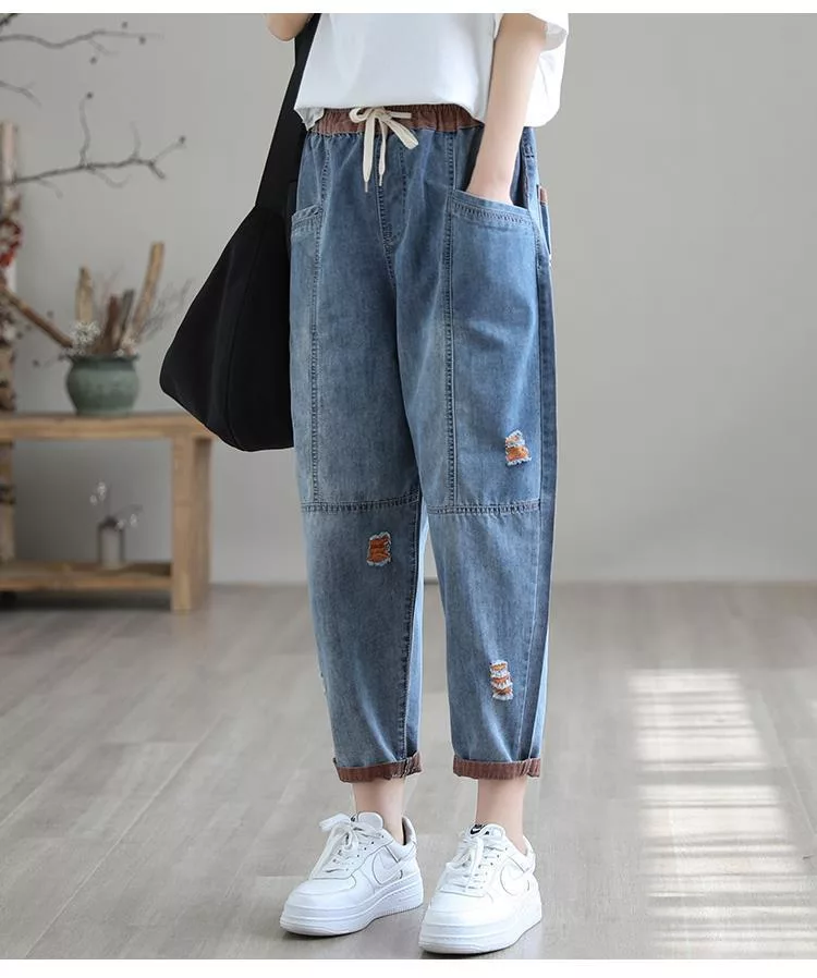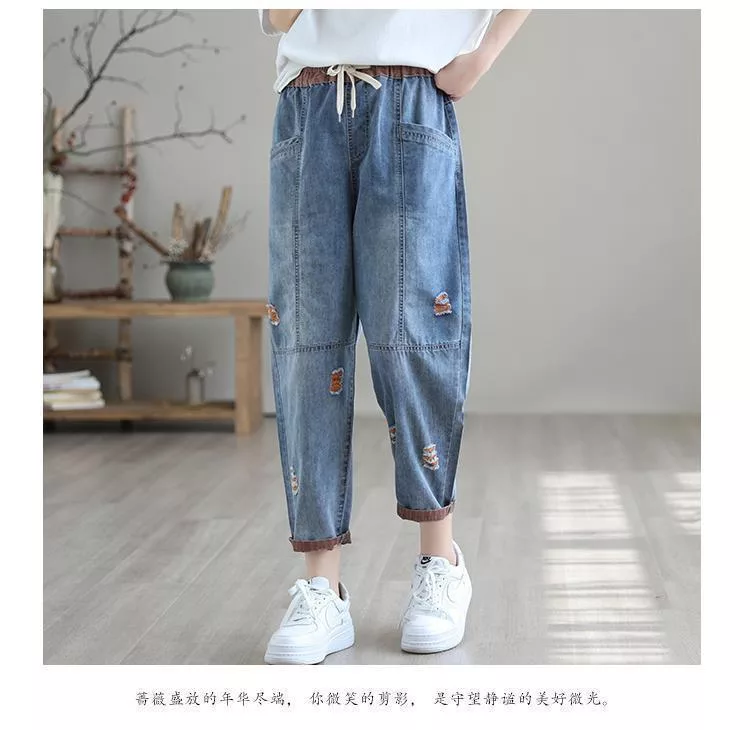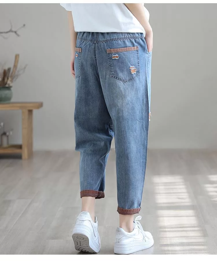 【慢。生活】復古撞色刺繡休閒大碼牛仔哈倫褲 J10584 FREE 橘色
