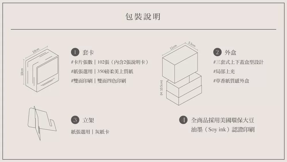 卡片採10×10公分IG風格設計,內附桌上立架,是人生整理套卡,也是妝點與佈置桌上、牆面的生活選物道具,讓生活變得更加有滋有味。