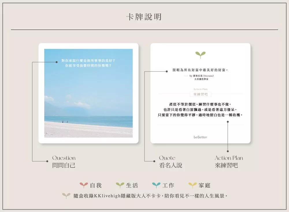 《be Better大人不卡卡》每組包含100 張人生整理套卡+2張使用說明卡,不僅是個與自己對話練習的工具,更可以是居家生活的選物道具,以及妝點風格的攝影寫真,值得你細細品味與收藏。