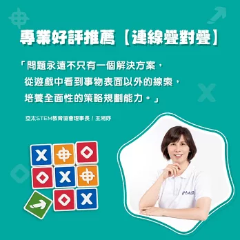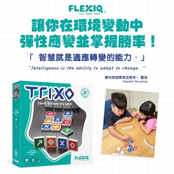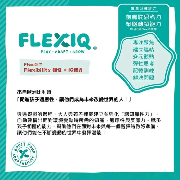 著名物理學家史蒂芬.霍金(Stephen Hawking)有一句名言:「智慧就是適應轉變的能力。」"Intelligence is the ability to adapt to change. " 適應性是一項基本的生活技能,讓人可以適應不斷變動的情況並有效地做出反應。「FlexiQ連線疊對疊」的遊戲過程中,我們的大腦將會不斷地鍛鍊,因應對手的每一個動作不斷地調整策略,同時,牌可以往上堆疊最多三層,創造更多變化與連線的可能,增進面對變動的適應性!幫助你我在面對未來與每一個世界變動時做好應變、發揮潛能!
