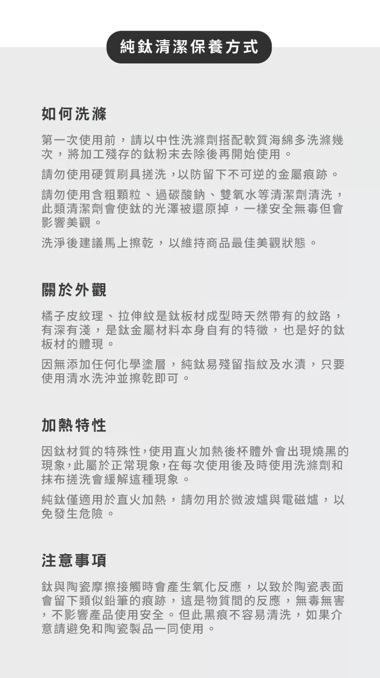 請勿使用含粗顆粒、過碳酸鈉、雙氧水等清潔劑清洗,此類清潔劑會使鈦的光澤被還原掉,一樣安全無毒但會影響美觀。