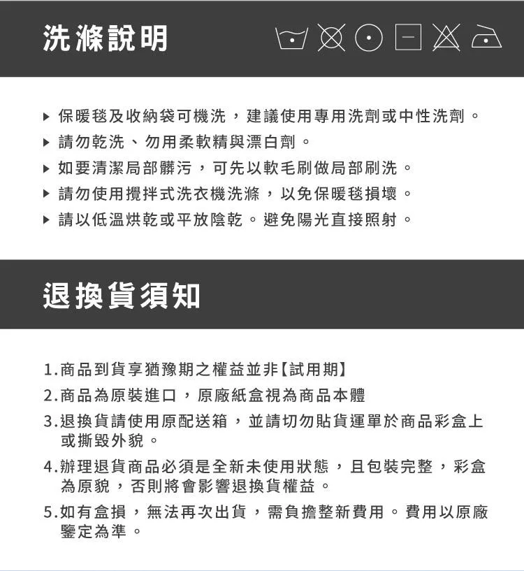 3. 退換貨請使用原配送箱,並請切勿貼貨運單於商品包裝上,或撕毀外貌。