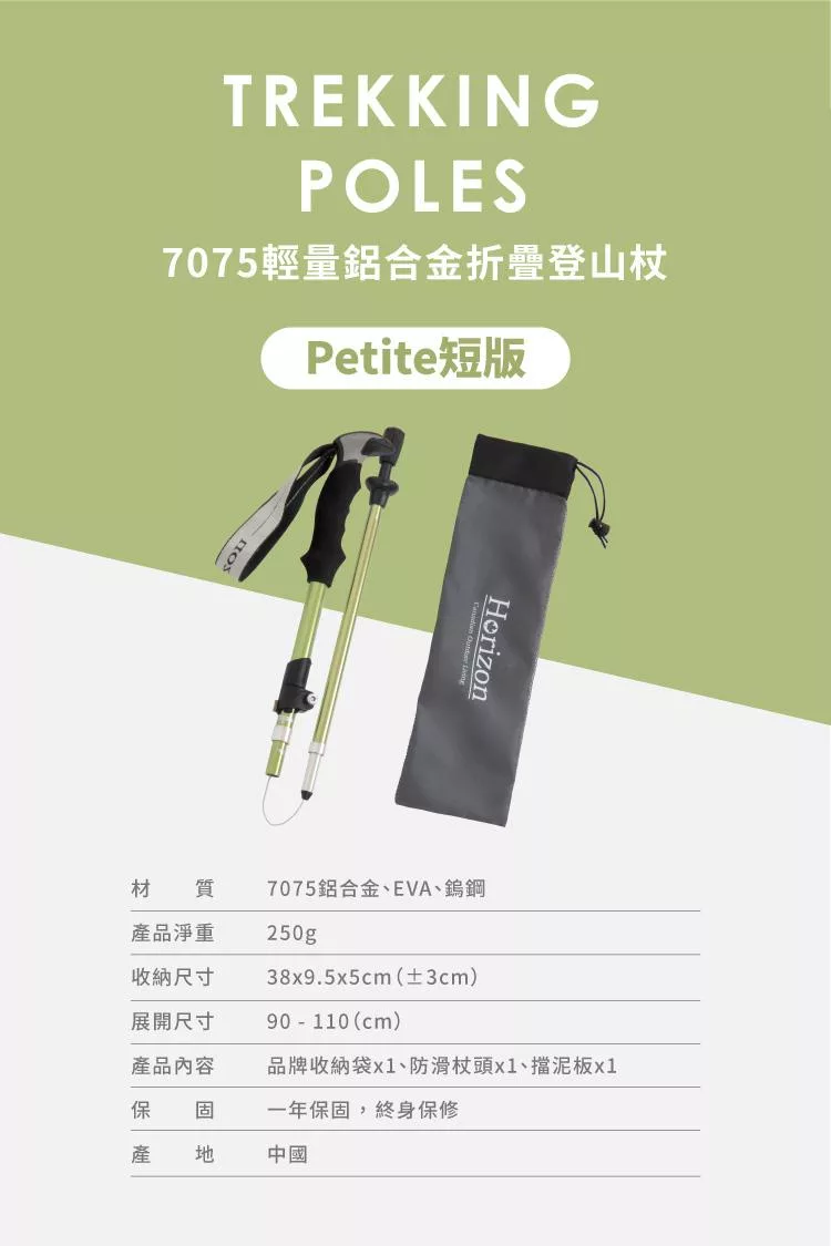 【Horizon 天際線】 Petite短版輕量鋁合金折疊登山杖 雲瑾綠