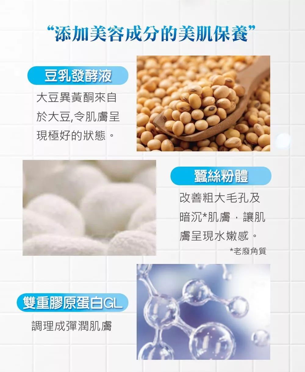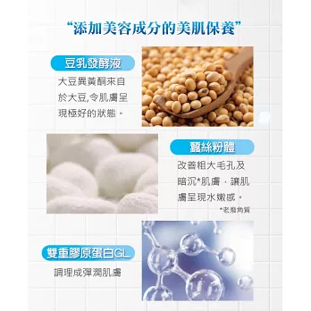 添加豆乳發酵液與保養成分,洗後不過度乾澀緊繃。