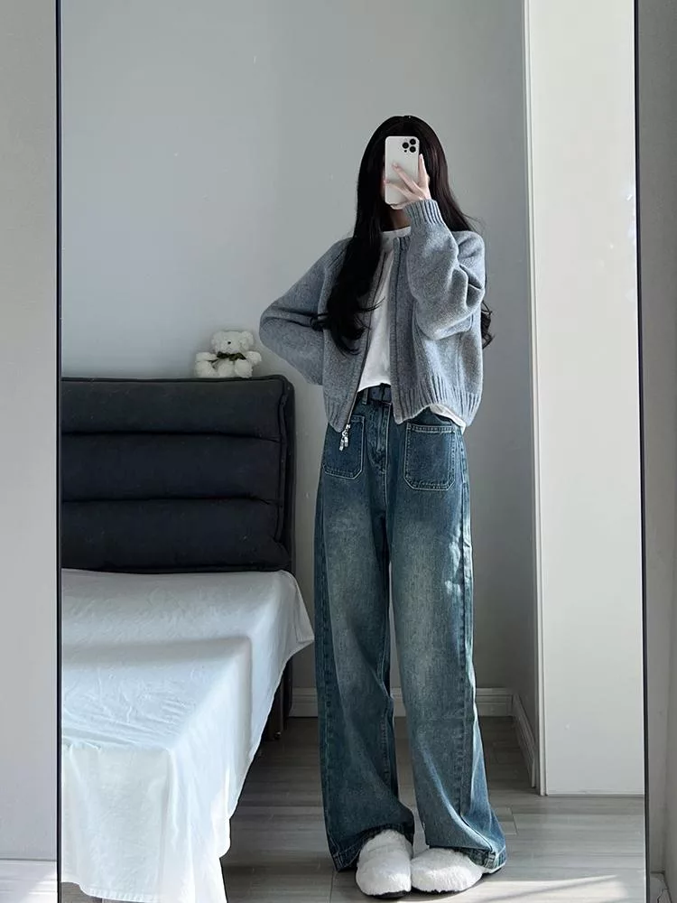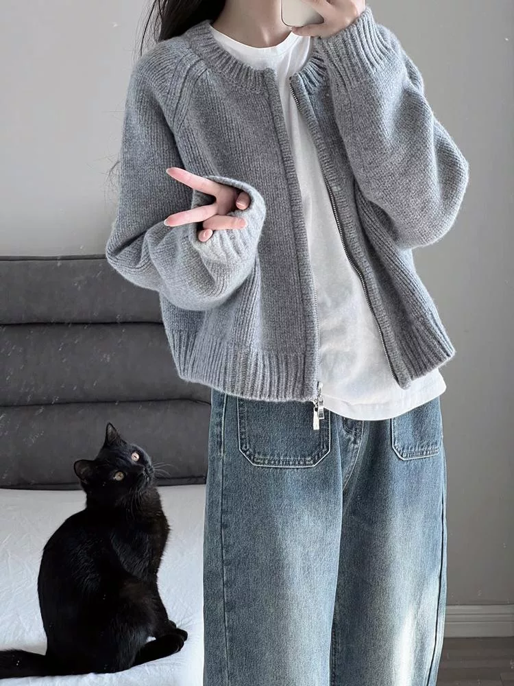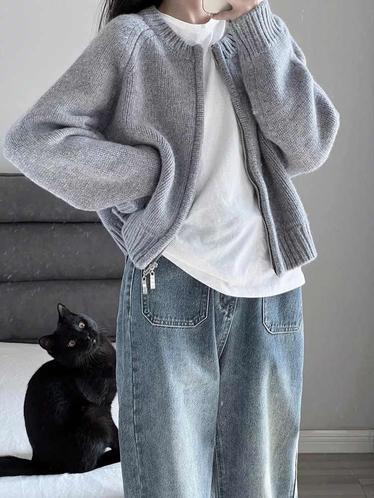 【Jilli~ko】加厚短款雙拉鍊長袖針織毛衣外套 J11082 FREE 灰色