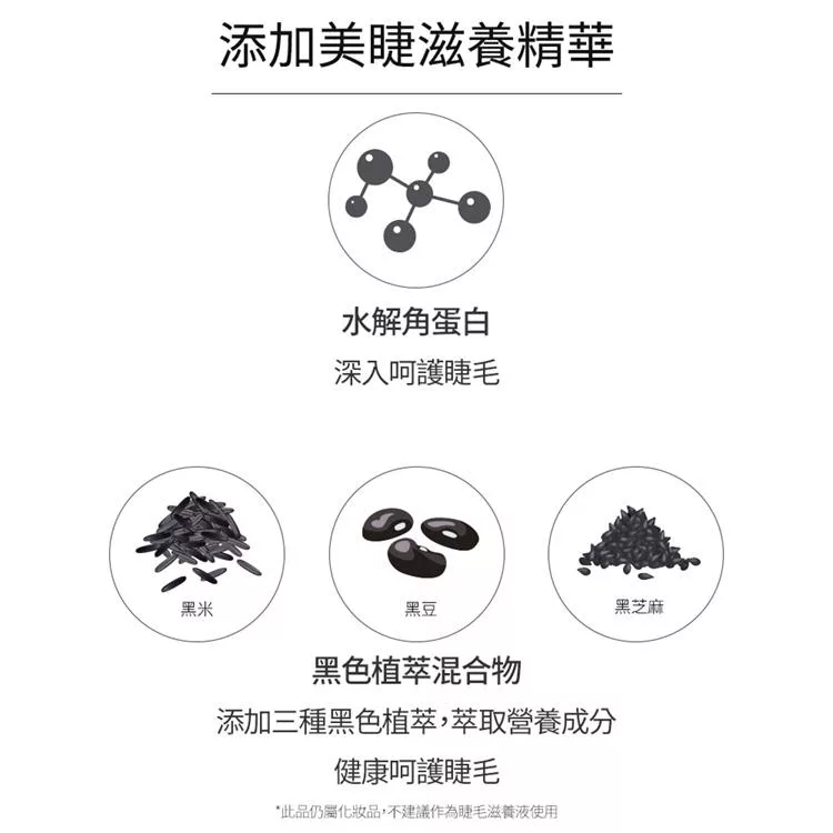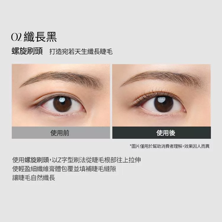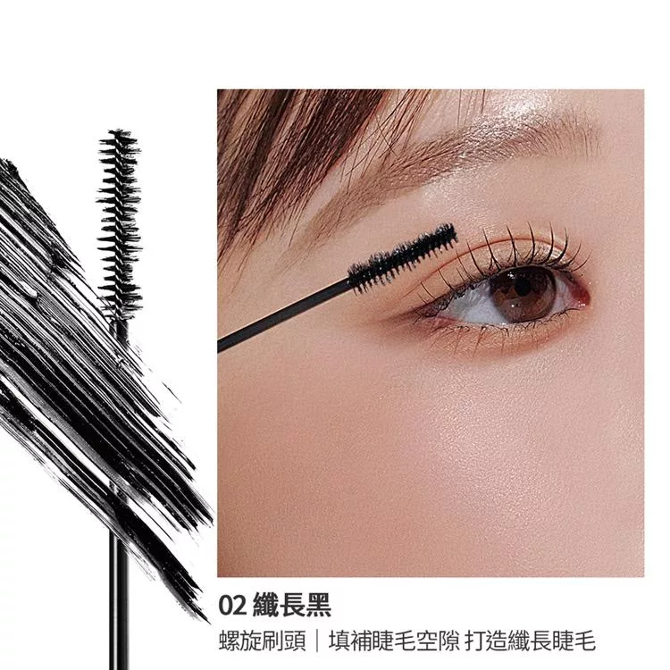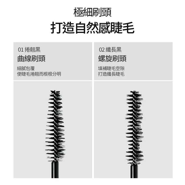 極度輕盈、延展性佳,一刷綻放根根分明、如原生睫毛般的氛圍感! 01捲翹黑: 採長直狀曲線刷頭,細膩包覆,使睫毛根根分明而捲翹。