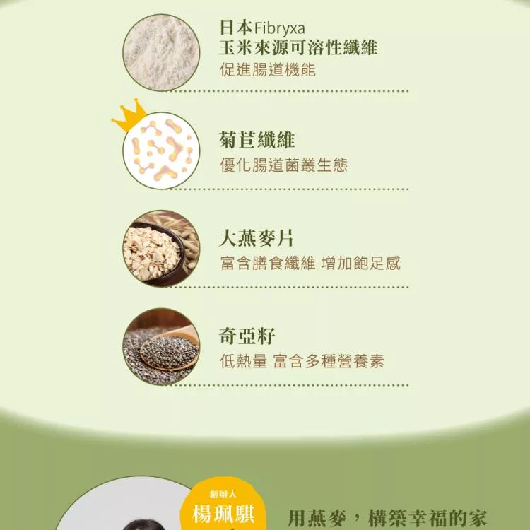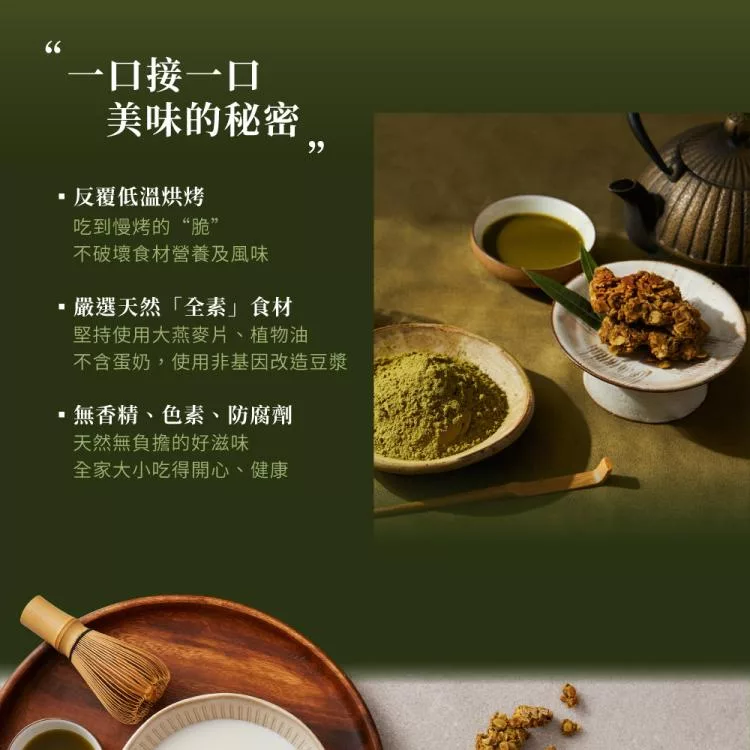 成分: 嚴選大燕麥片、糖、芥花油、穀豆粉(燕麥、小麥、大麥、紅扁豆、黑糯米、小米、蕎麥、綠豆、黃豆、青仁黑豆)、南瓜子、玉米來源可溶性纖維、菊苣纖維、抹茶粉、奇亞籽、食鹽(含碘