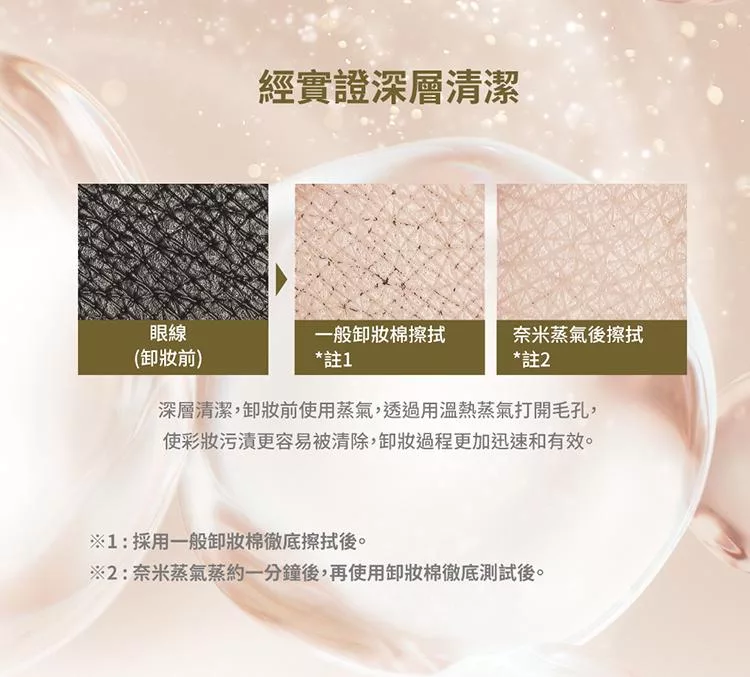 ◆深層清潔,卸妝前使用蒸氣,透過用溫熱蒸氣打開毛孔,使彩妝污漬更容易被清除,卸妝過程更加迅速和有效。