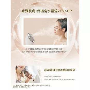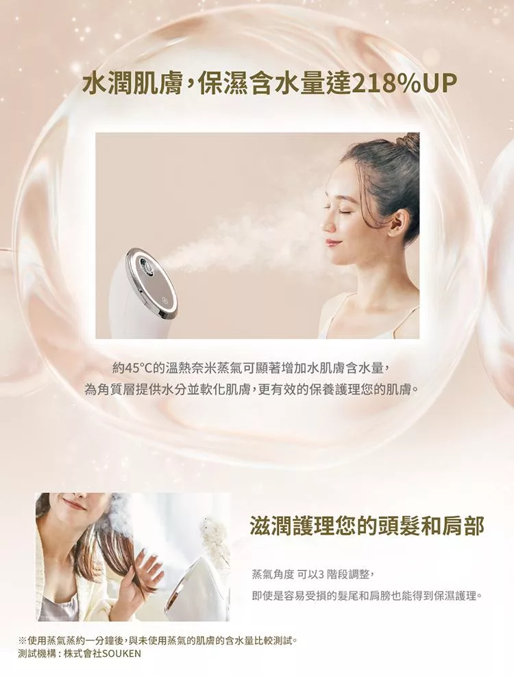 ◆改善妝容,在化妝前使用蒸氣,滋潤肌膚,使肌膚更光滑,進而提升妝容效果。