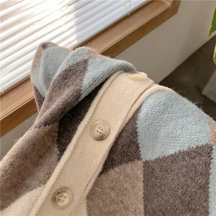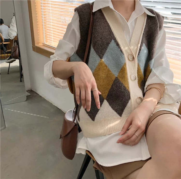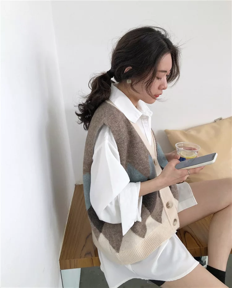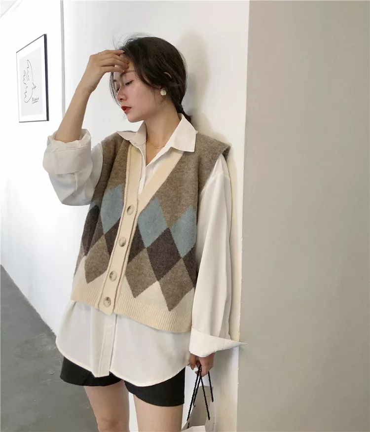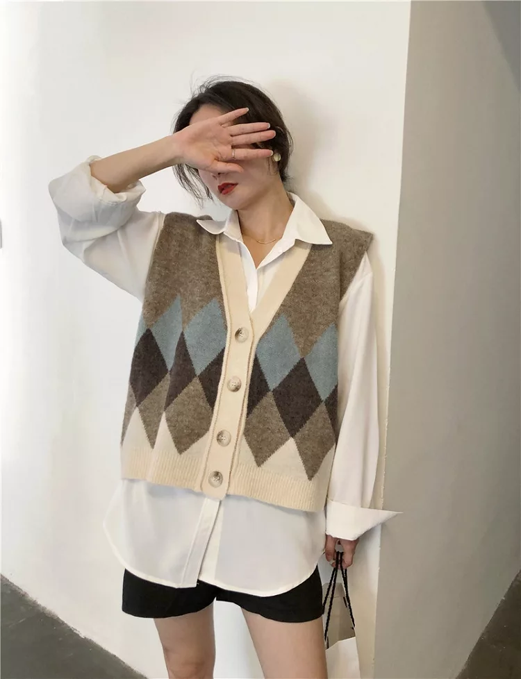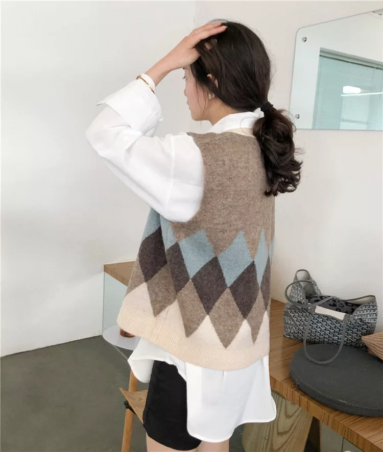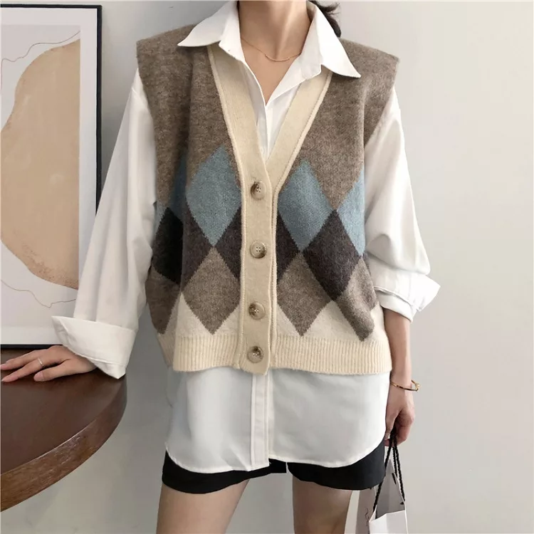 【Jilli~ko】配色菱格毛呢針織背心 1328  FREE 淺咖