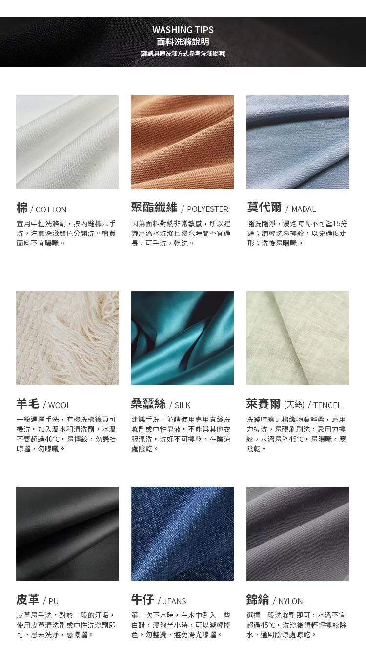 ●可水洗晾乾,不能使用冷洗精、柔軟精及漂白水,不能乾洗