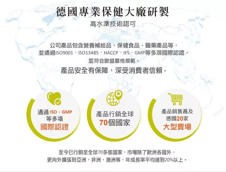 獨家代理德國保健食品:好立善/Heilusan,有機認證的天然草本化妝品:草本莊園、德國植萃、麗柏有機等;以及德國花茶、花果茶:德國童話。