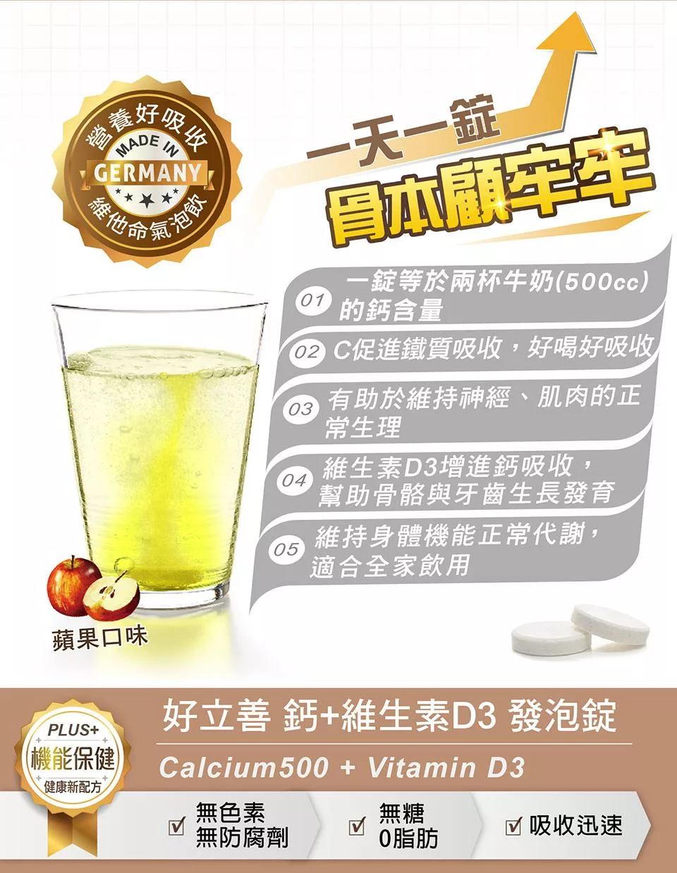 德國 好立善 鈣+D3發泡錠 (20錠)(到期日2028/4/30) 蘋果口味