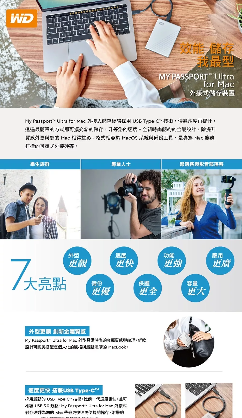 WD My Passport Ultra for mac 2TB 2.5吋USB-C行動硬碟-炫光銀