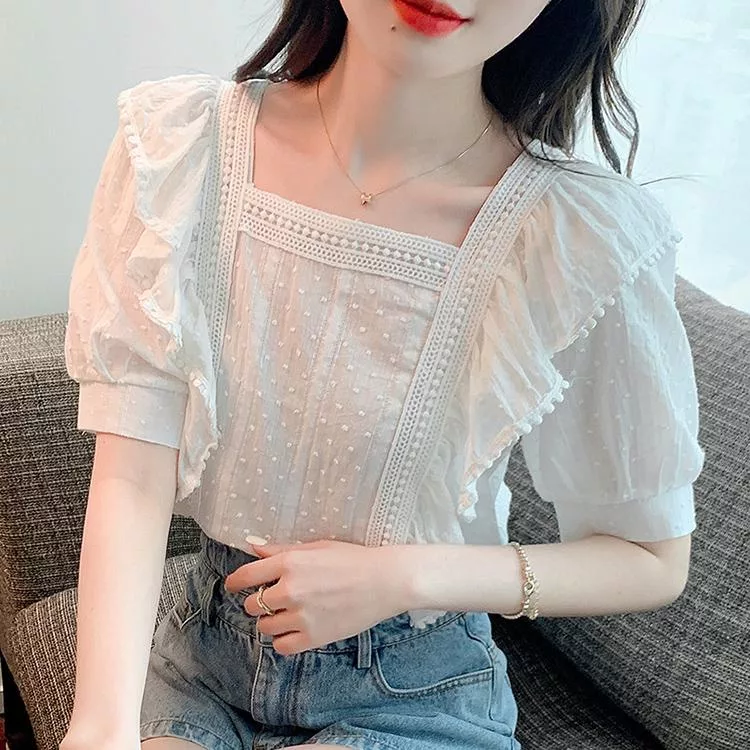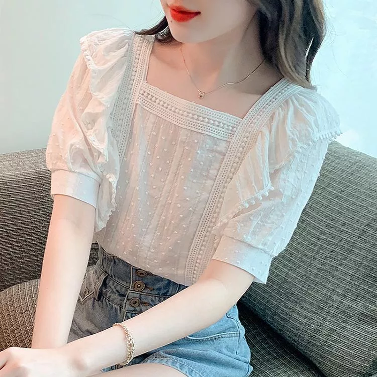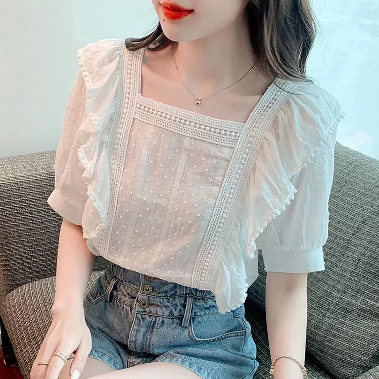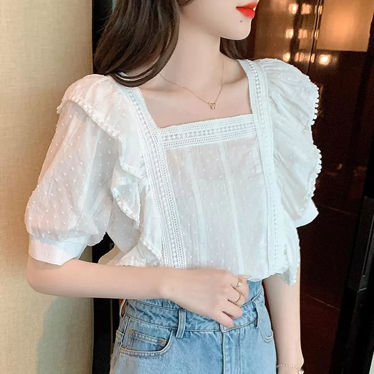 【Jilli~ko】小清新方領荷葉邊甜美蕾絲泡泡袖上衣 J11631  FREE 白色
