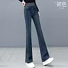 【初色】通勤風提臀顯瘦高腰鬆緊腰牛仔褲直筒喇叭褲休閒褲寬褲長褲-共2款-16038(M-5XL可選) M 深藍色九分加絨款
