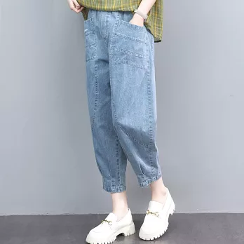 【慢。生活】薄款牛仔鬆緊高腰寬鬆百搭刺繡口袋七分褲 72960  FREE 藍色