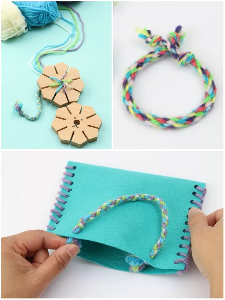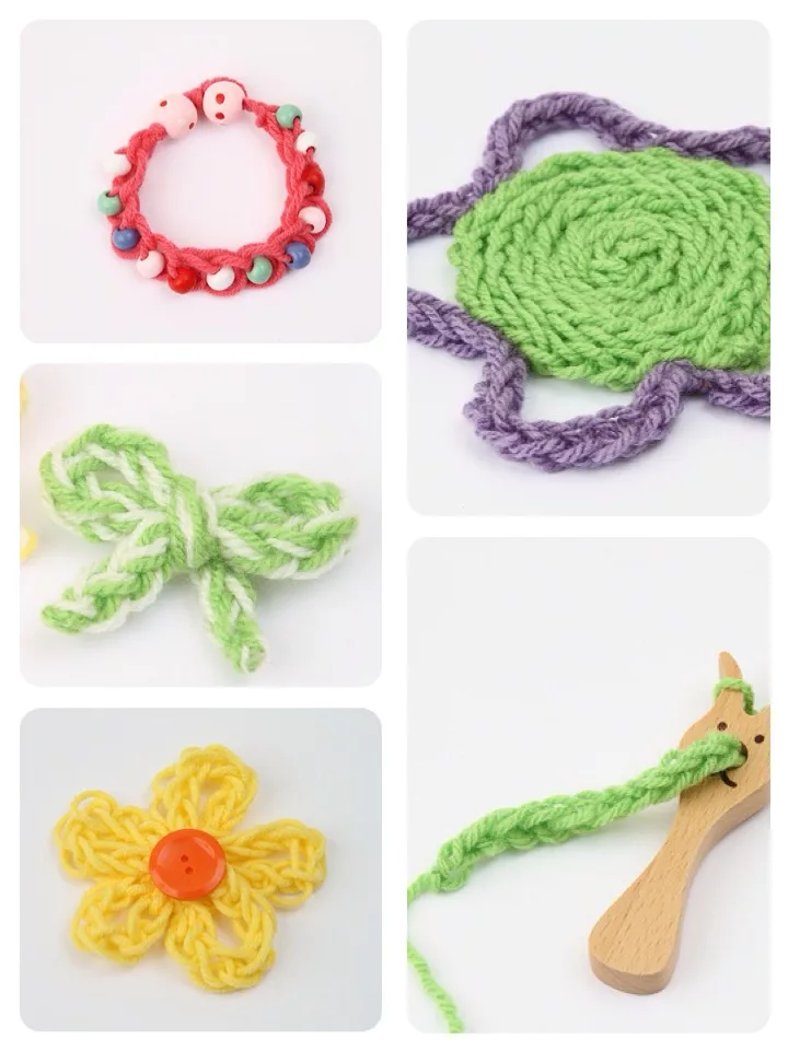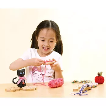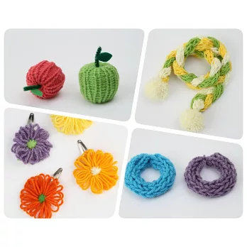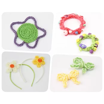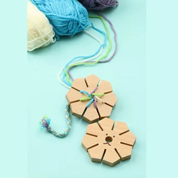 「巧手編織器」含有三種編織器,讓孩子有多樣的編織體驗。天然櫸木材質、可愛的動物造型,適合幼兒抓握。兔子編織器可以織成項鍊、手環、花,獅子編織器為手環編織器,透過簡單的規則就可以編出手環,圈圈編織器可以編出筒狀的作品,做出圍巾、花和針插等。