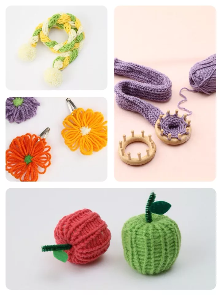 內容物/原木編織器3個、編織手冊1本、毛線1捆(紅、紫、粉紅三色隨機出貨)