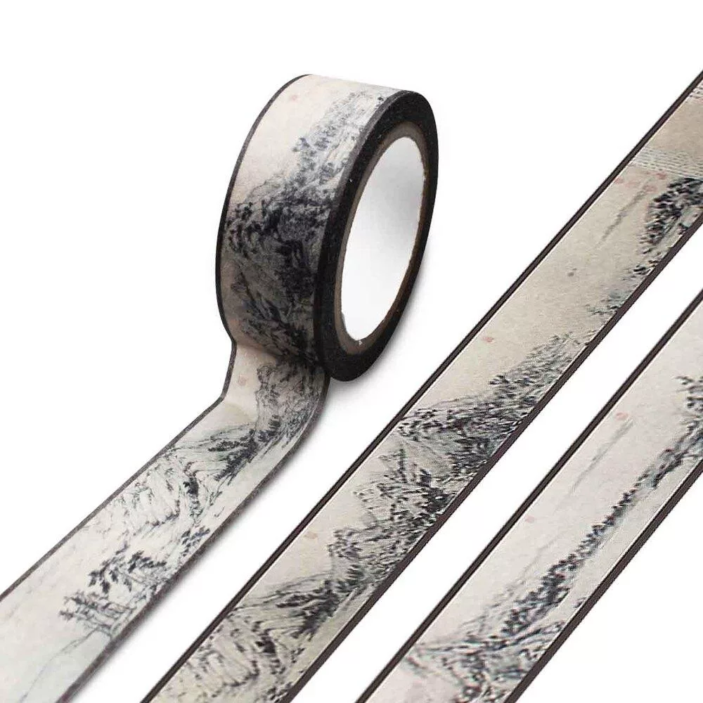 以整幅富春山居圖卷設計,利用山水墨韻筆畫,風情特色濃厚並做成和紙膠帶形式更加趣味。可搭配筆記本、信封、禮品包裝使用,為生活增添一層趣味色彩。
