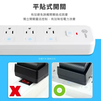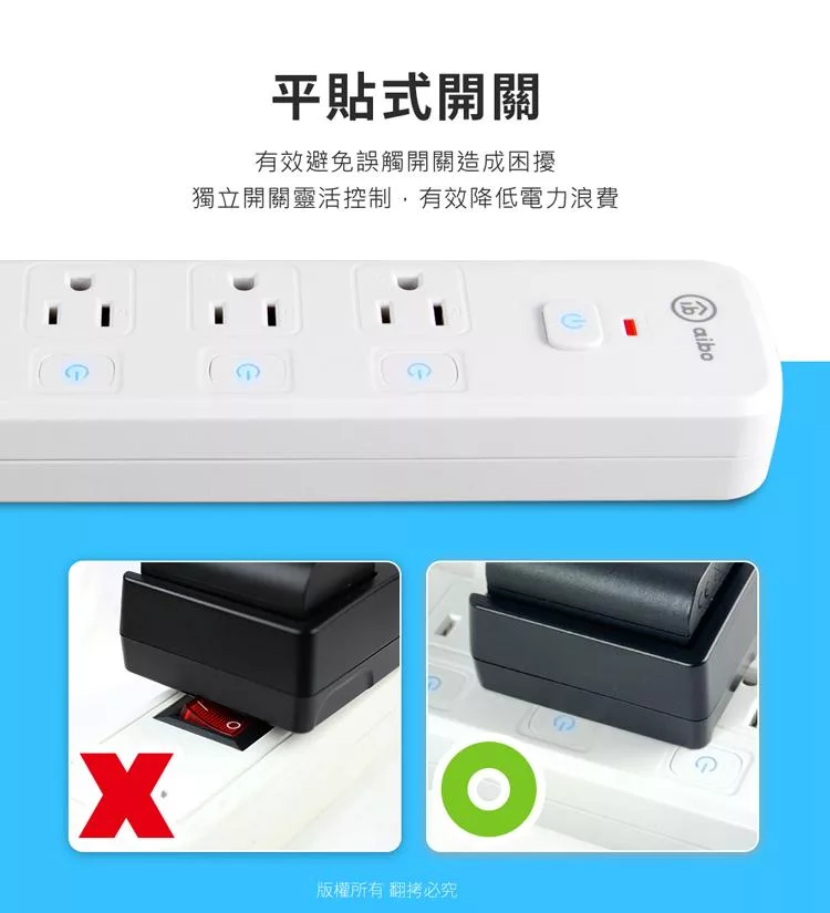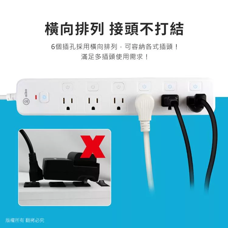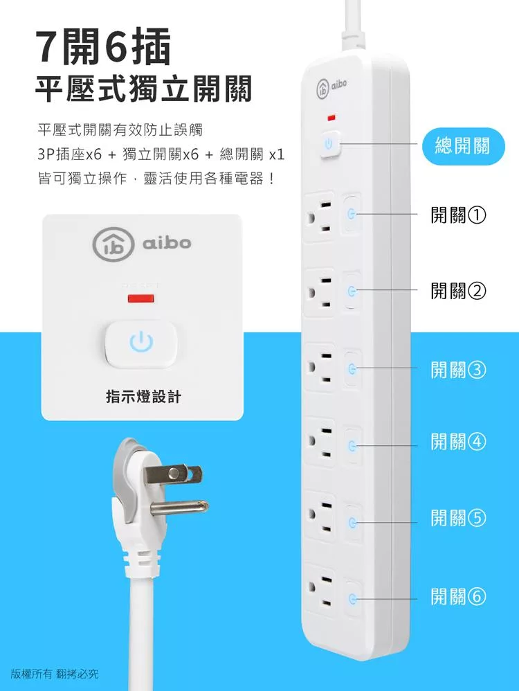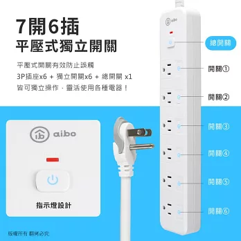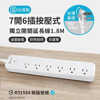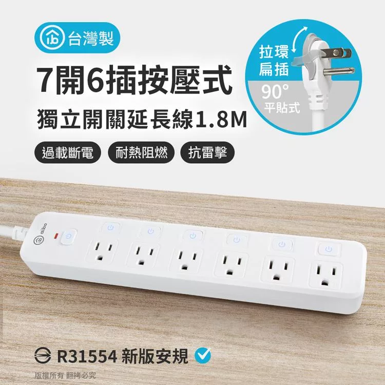 aibo 台灣製 7開6插按壓式 過載斷電開關延長線(拉環扁插)-1.8米