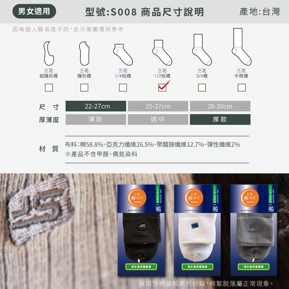 布料:棉58.8%、亞克力纖維26.5%、聚醯胺纖維12.7%、彈性纖維2%