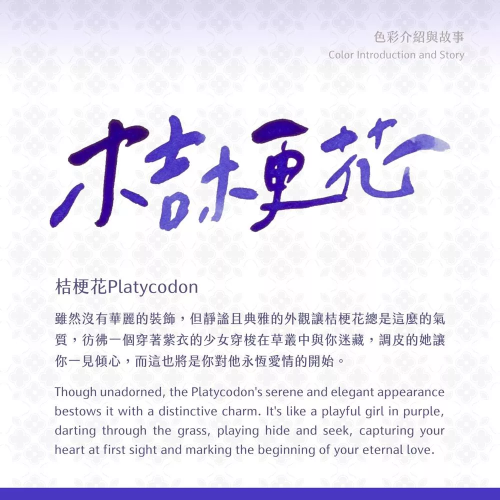 雖然沒有華麗的裝飾,但靜謐且典雅的外觀讓桔梗花總是這麼的氣質,彷彿一個穿著紫衣的少女穿梭在草叢中與你迷藏,調皮的她讓你一見傾心,而這也將是你對他永恆愛情的開始。