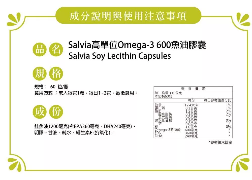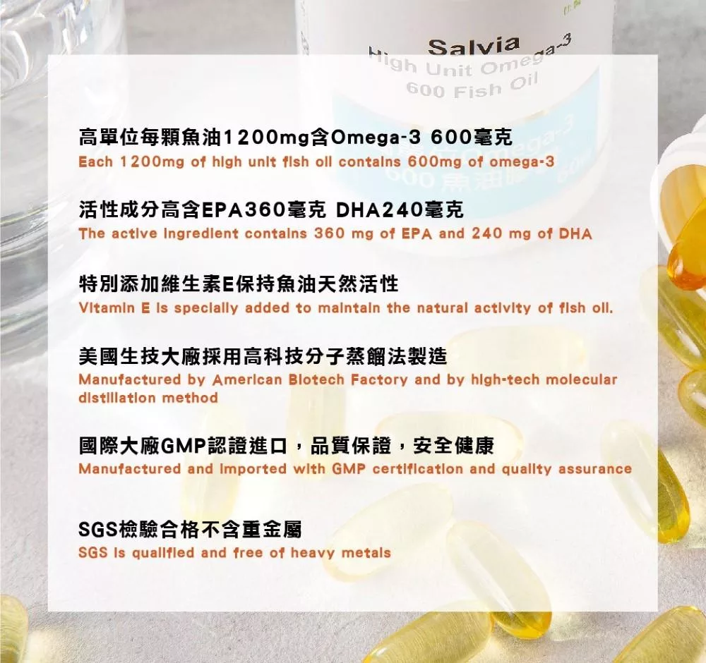 Salvia Omega-3 600 魚油 採用美國高科技分子蒸餾技術,將深海鮭魚的珍貴精華濃縮於每一顆膠囊中。