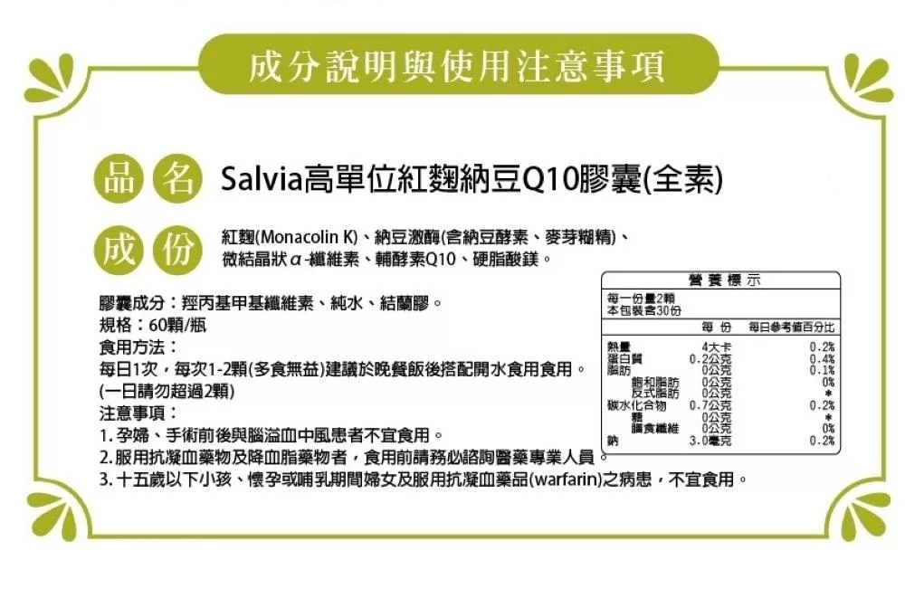 2.服用抗凝血藥物及降血脂藥物者, 食用前請務必諮詢醫藥專業人員。