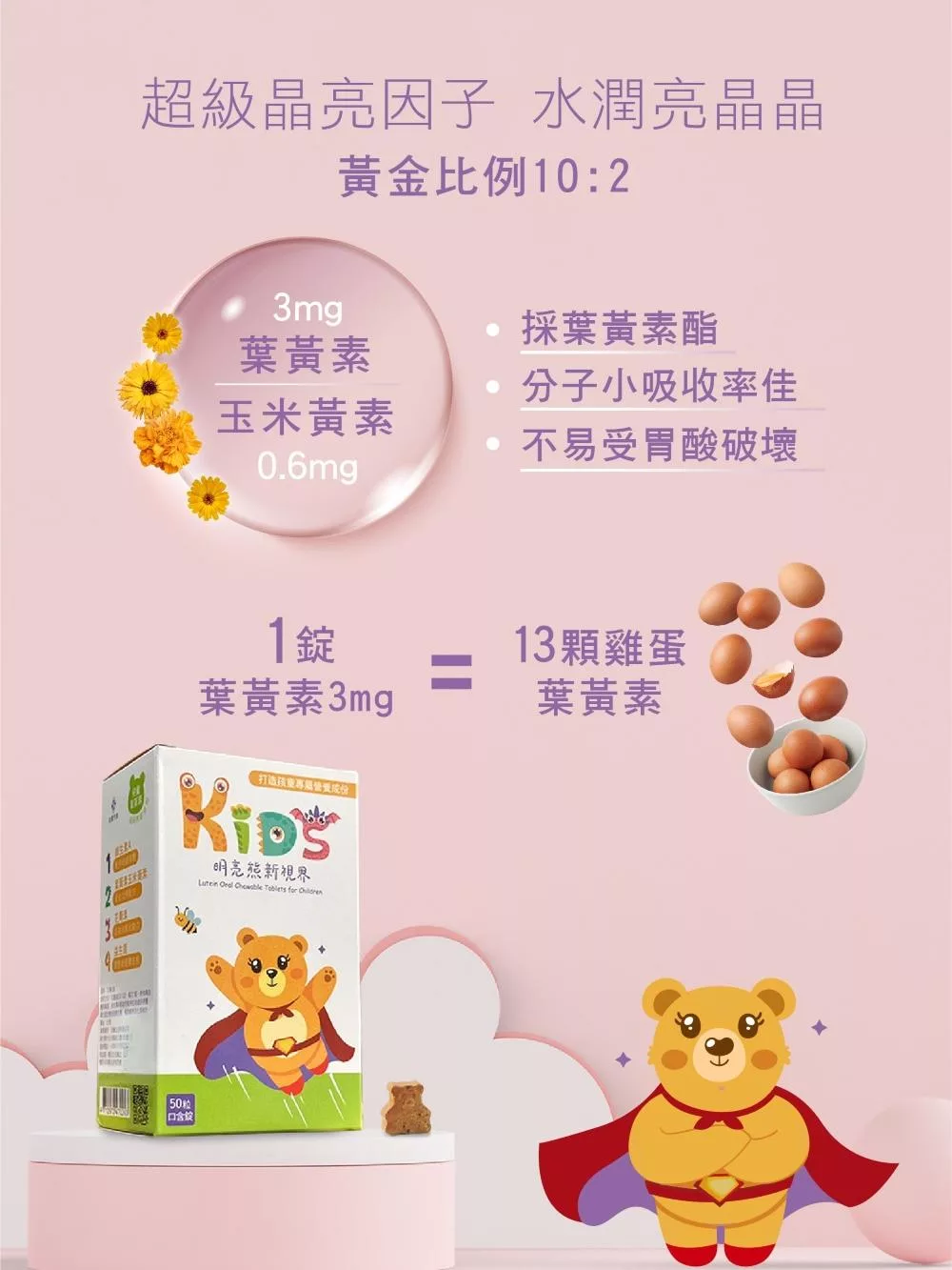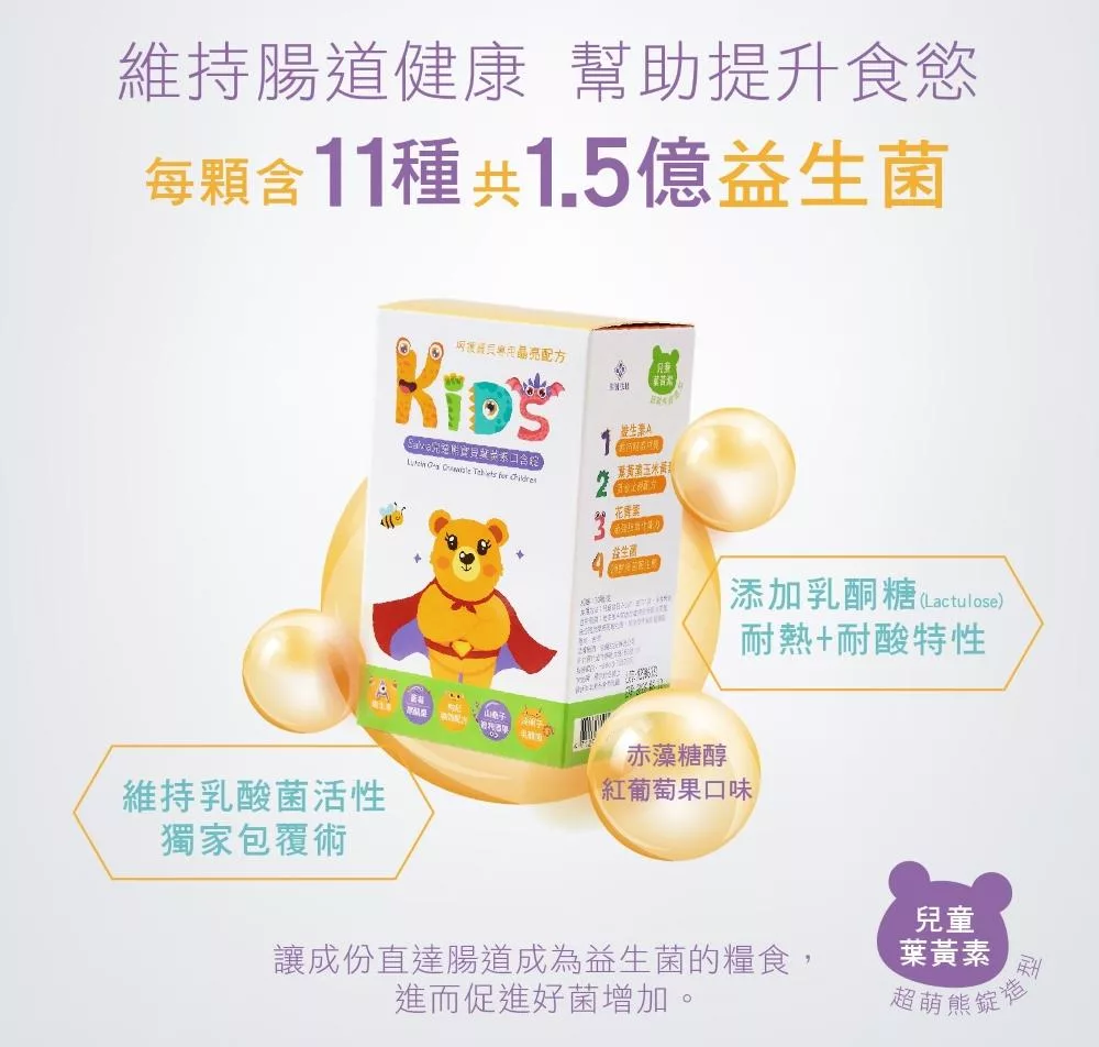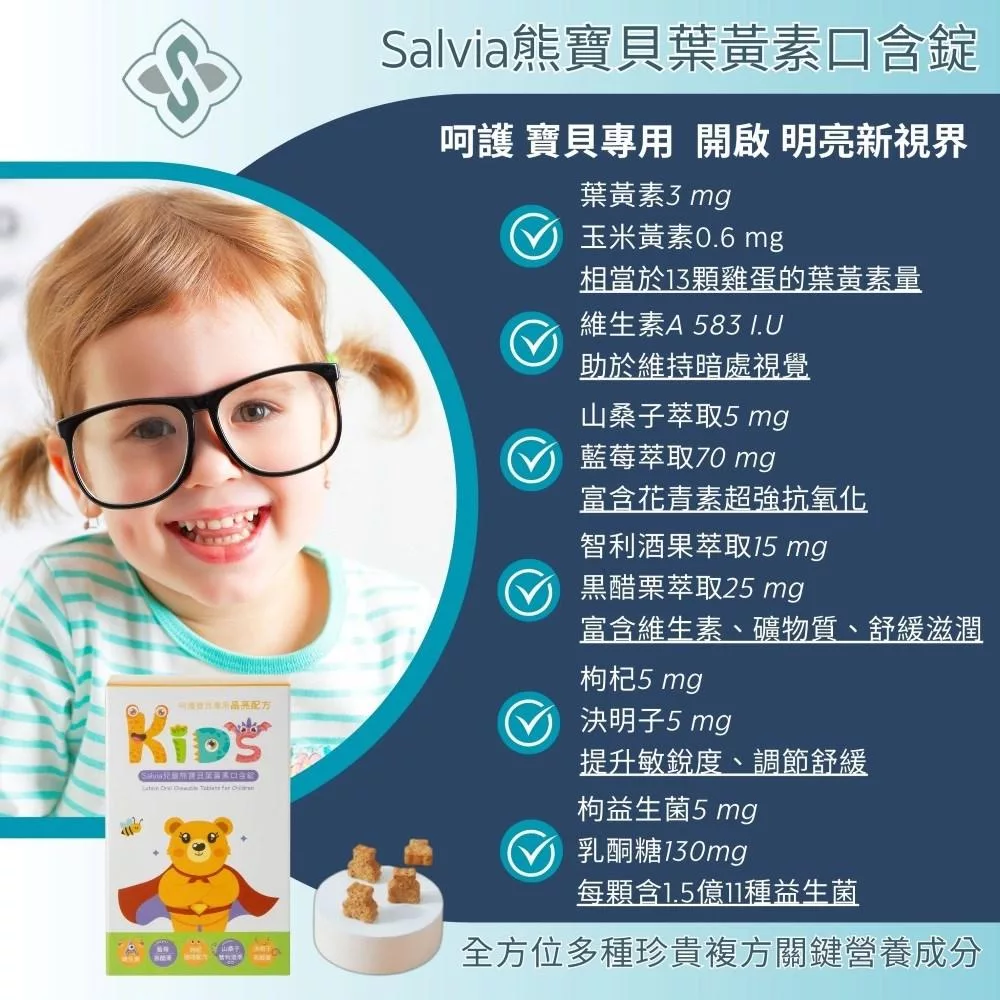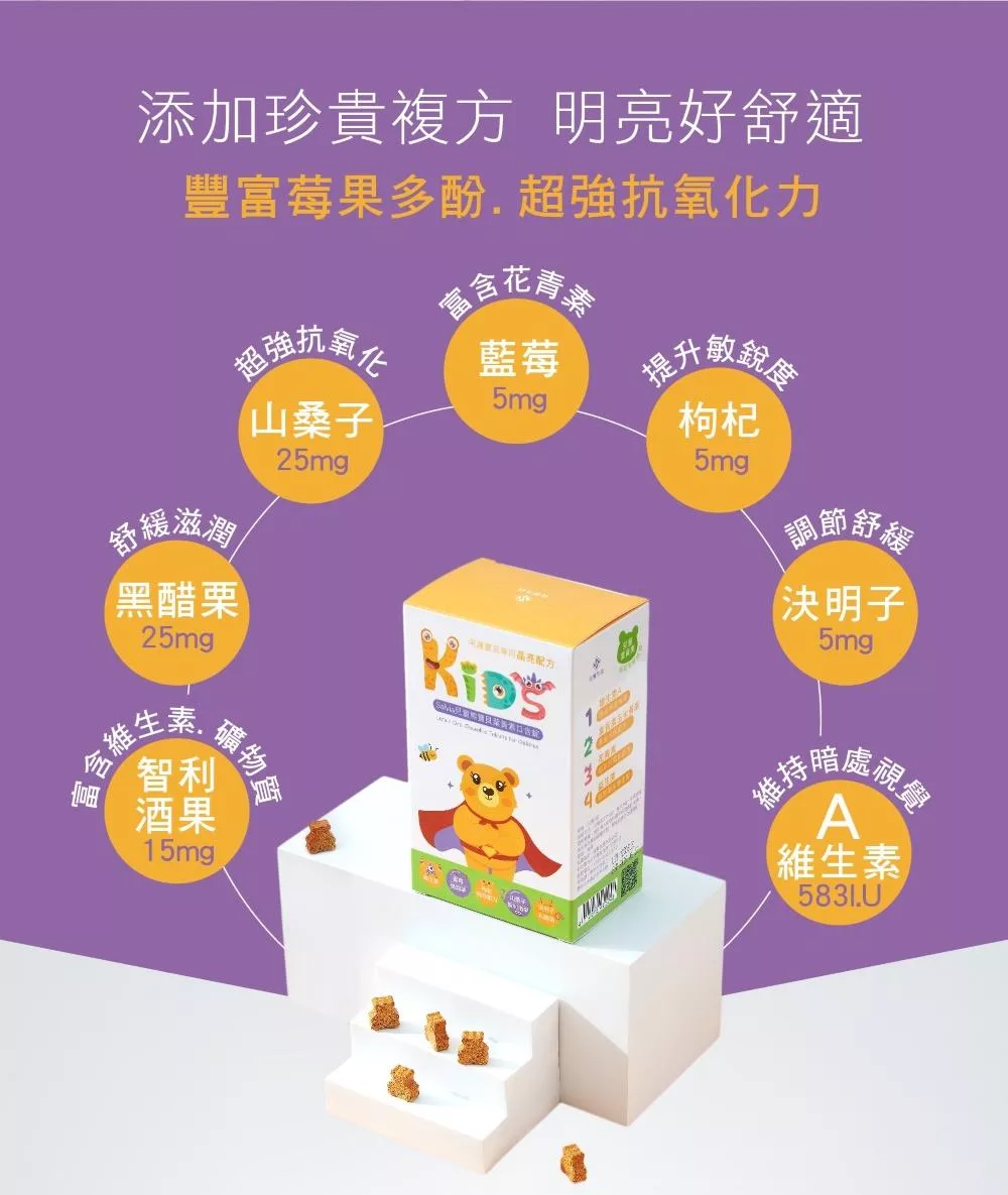 兒童專用全方位珍貴複方關鍵營養成份葉黃素+玉米黃素+維生素A+智利酒果+?醋栗+山桑子+藍莓+枸杞+決明子+益生菌