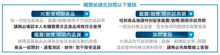 3.產品一經拆封、連線註冊後,均需額外收取退貨整新費用。