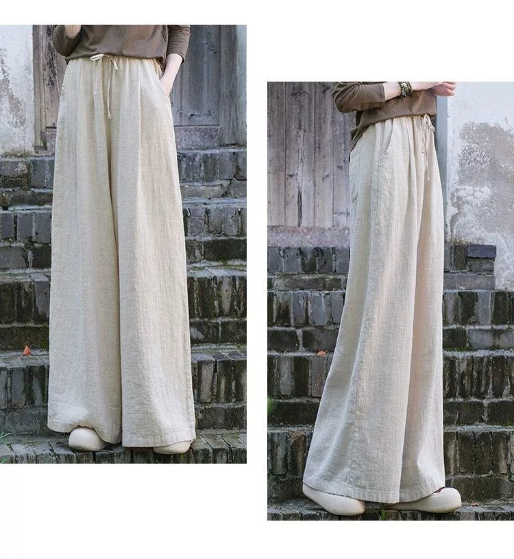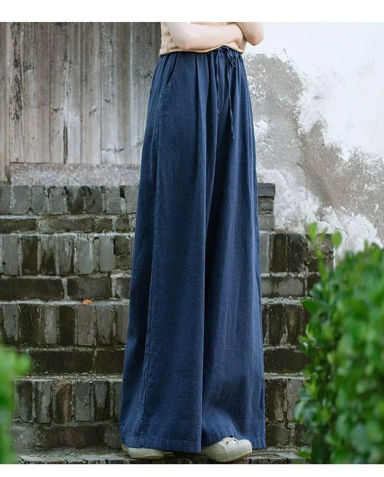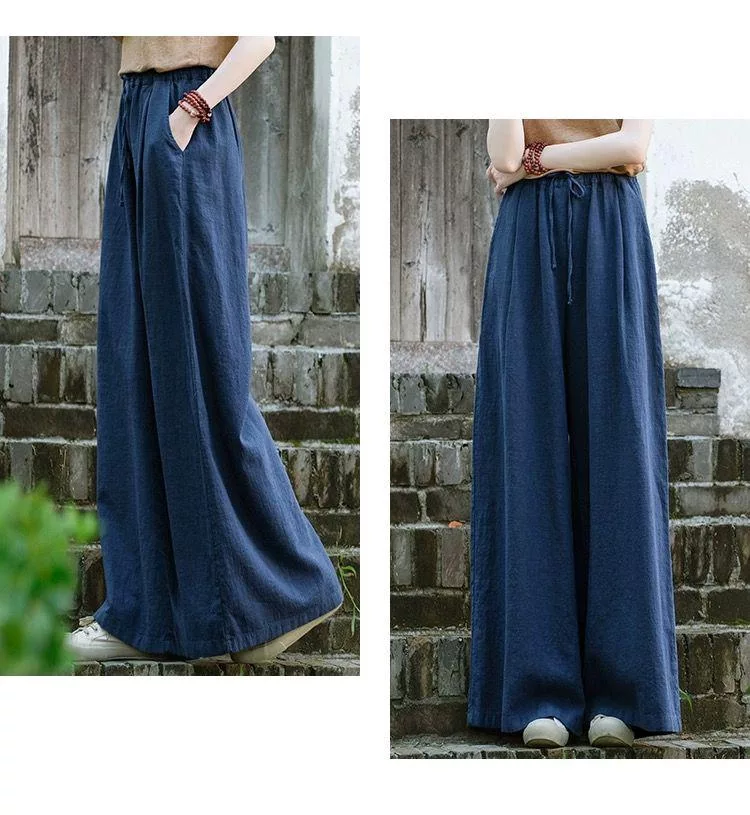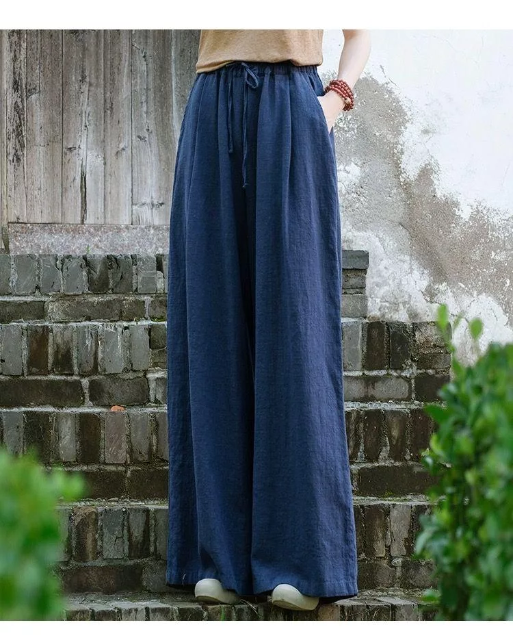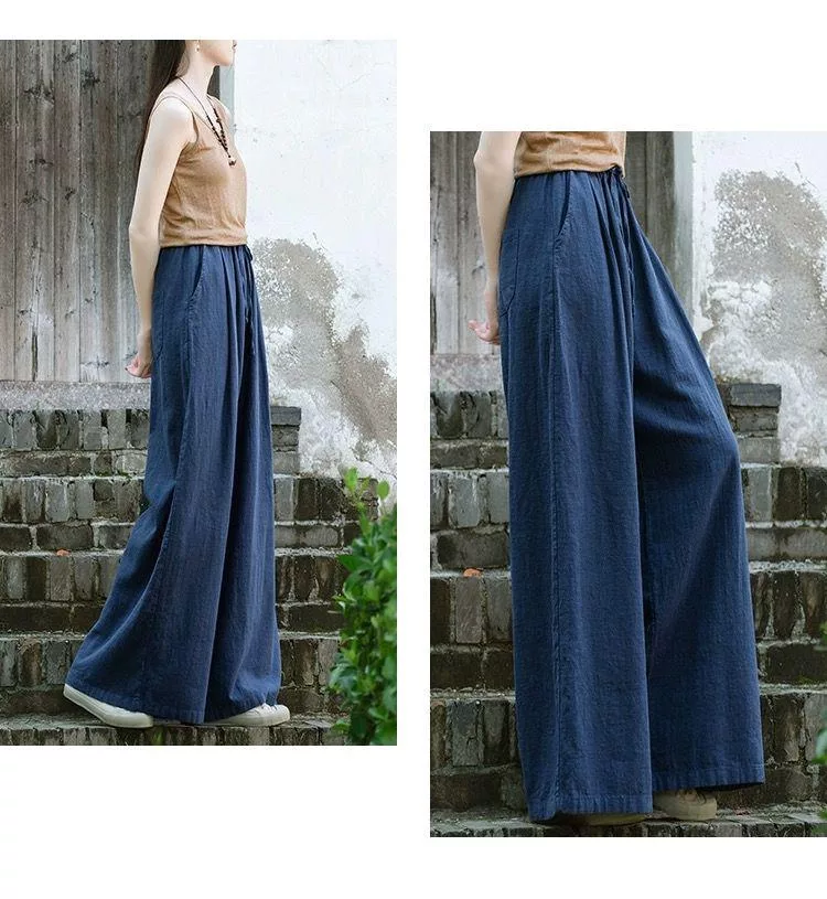 【慢。生活】中大尺碼鬆緊高腰文藝棉麻拖地闊腿褲 Y566 FREE 深藍色 FREE 深藍色