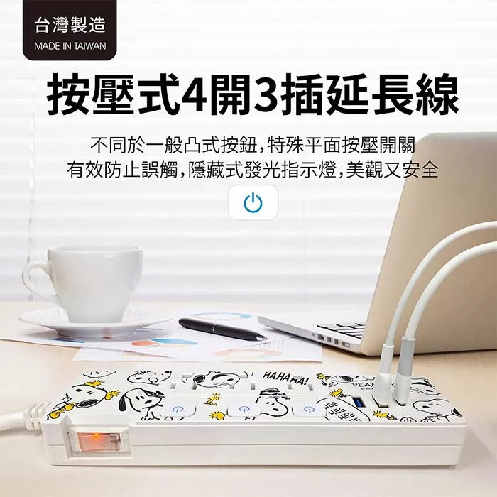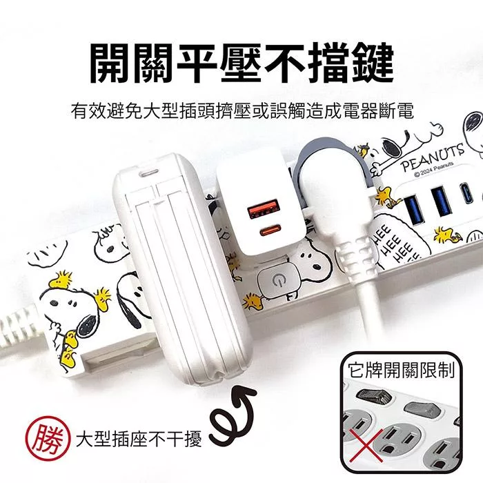【正版授權】SNOOPY史努比 PD 37W平貼式延長線 按壓式4開3插+USB/Type-C延長線 1.8M 百變生活