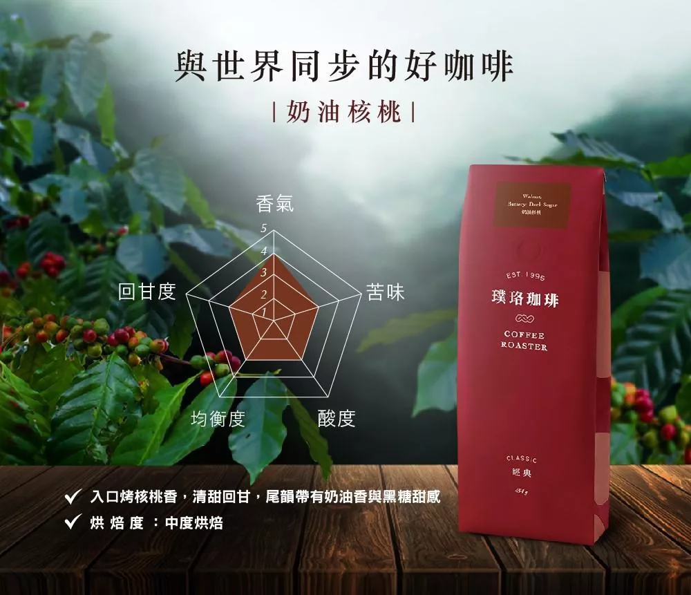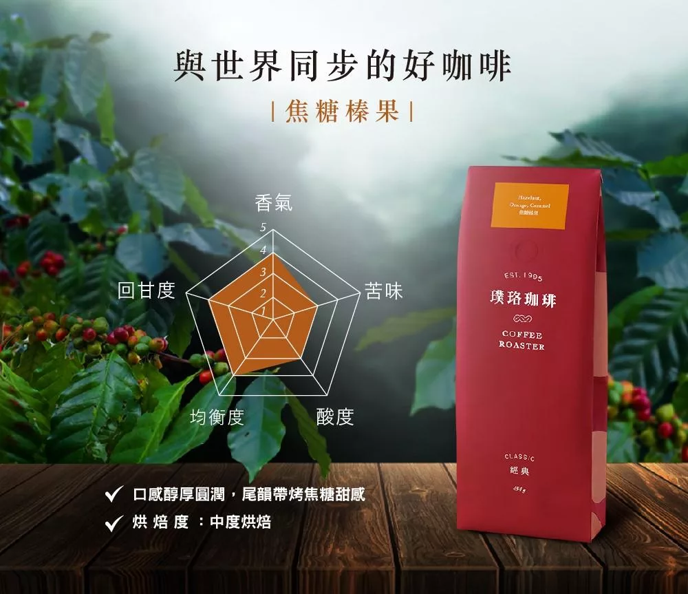 中度烘焙,明顯的松木香氣,繼而感受到濃郁烤堅果與橙皮的酸甜滋味,口感醇厚圓潤,持續到尾段有烤焦糖的宜人甜感。