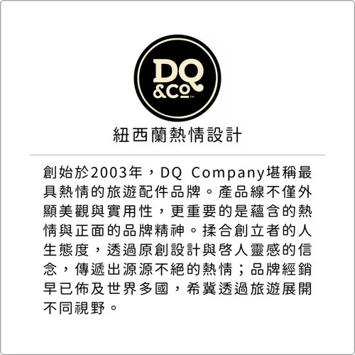 創始於 2003 年,DQ Company 堪稱最具熱情的旅遊配件品牌。產品線不僅外顯美觀與實用性,更重要的是蘊含的熱情與正面的品牌精神。揉合創立者的人生態度,透過原創設計與啟人靈感的信念,傳遞出源源不絕的熱情;品牌經銷早已佈及世界多國,希冀透過旅遊展開不同視野。