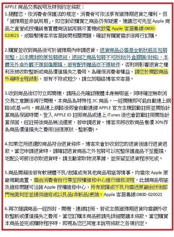1.APPLE商品為特殊性3C商品,經連線註冊(含開機及啟動wifi)登入APPLE ID或連上iTunes後,該商品即被註冊,且開始計算商品保固時間,經註冊商品無法還原,若申請退換貨,則需另收商品整新費用。