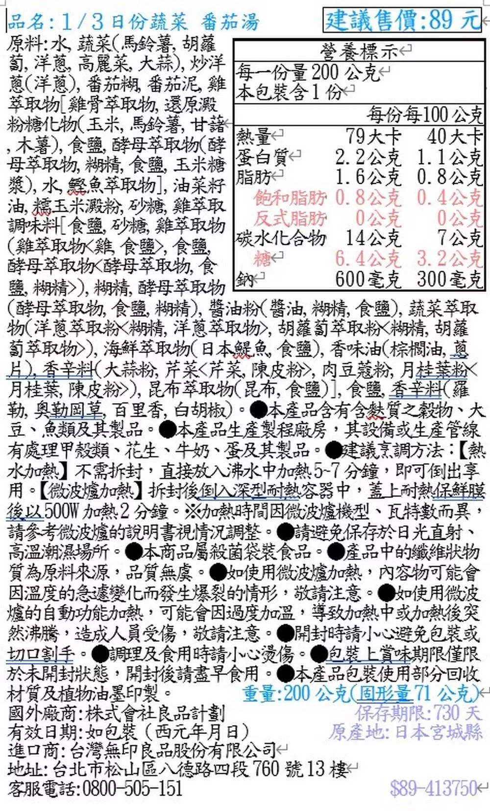 ●商品說明:將番茄的酸味融合羅勒、百里香、奧勒岡等香草,再加入馬鈴薯、高麗菜等四種蔬菜,可攝取到每日所需1/3份的蔬菜。