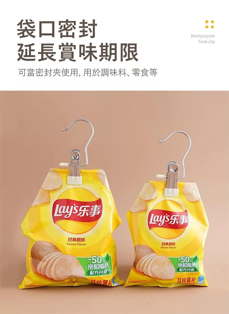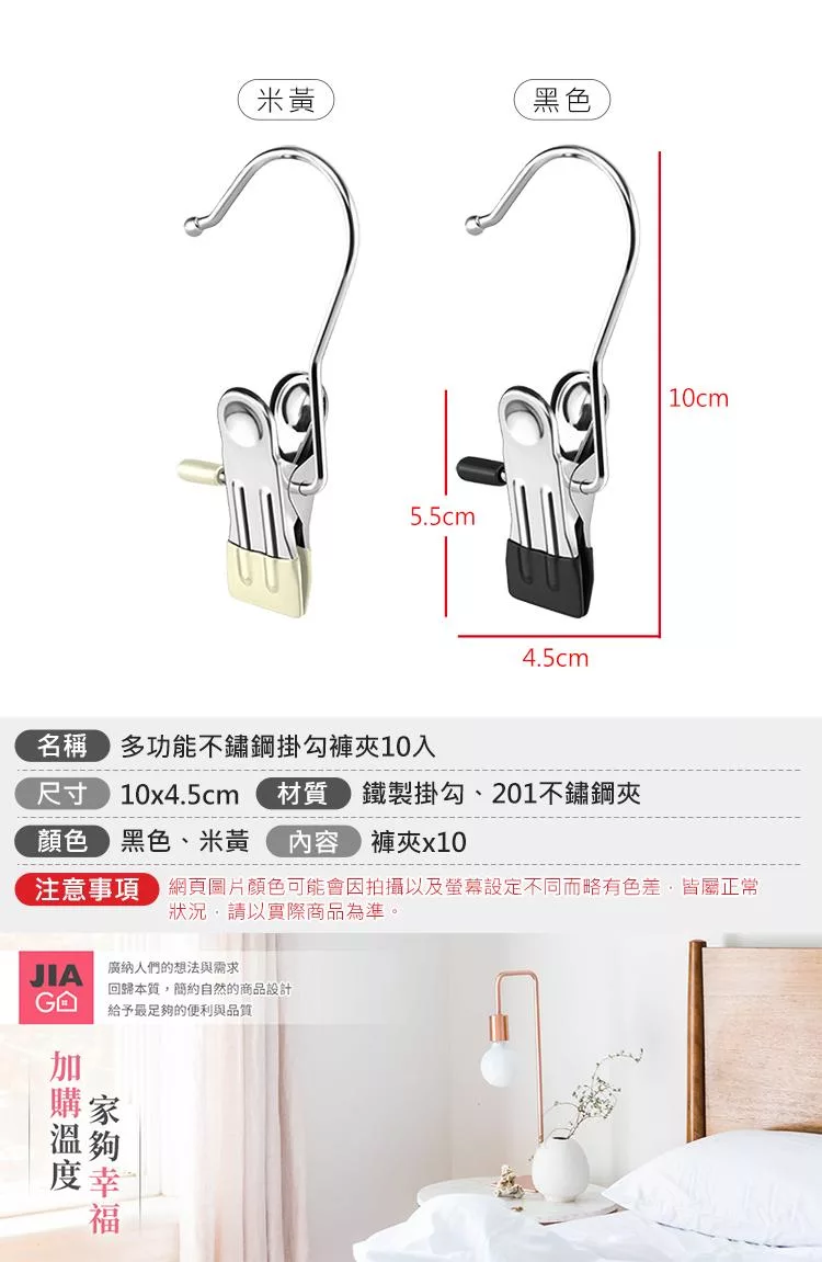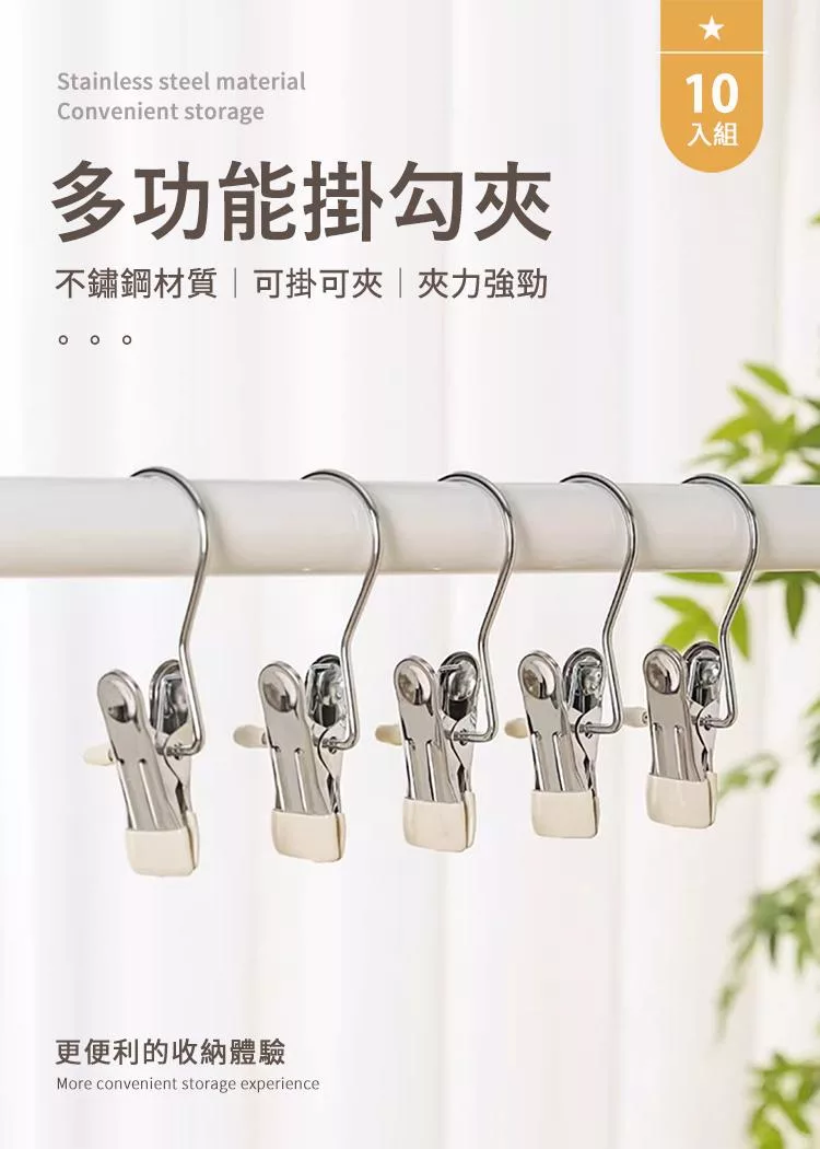 【E.dot】多用途不鏽鋼掛勾夾 -10入(褲夾 / 襪夾 / 零食密封夾 / 曬衣夾) 米黃