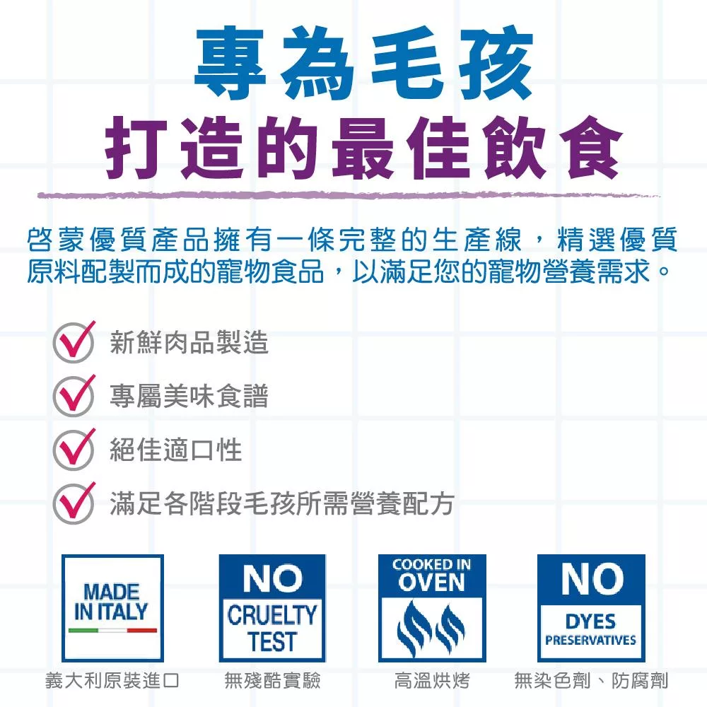 主成份:肉類和動物副產品45%(新鮮牛肉最少6%,火腿最少6%),礦物質