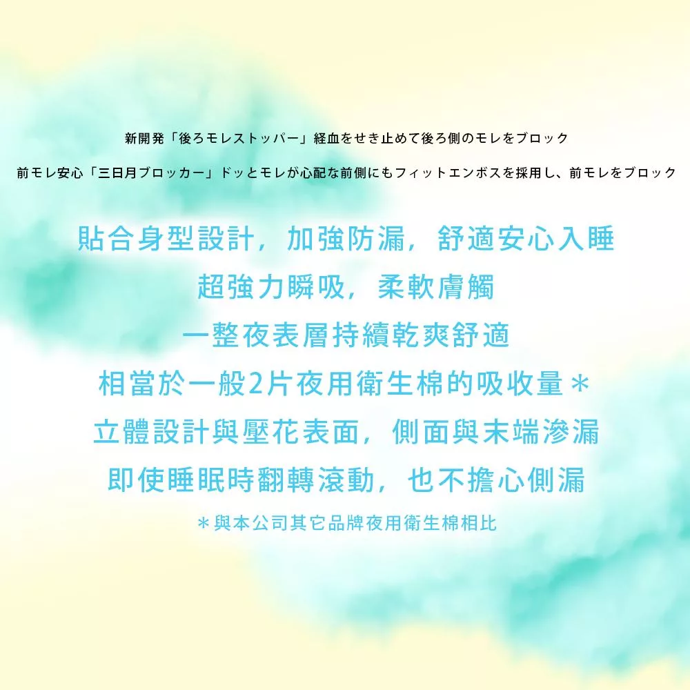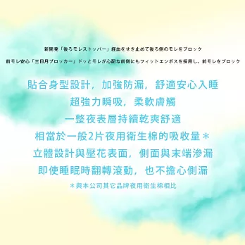 ●貼合身型設計,加強防漏,舒適安心入睡●超強力瞬吸,柔軟膚觸,一整夜表層持續乾爽舒適
