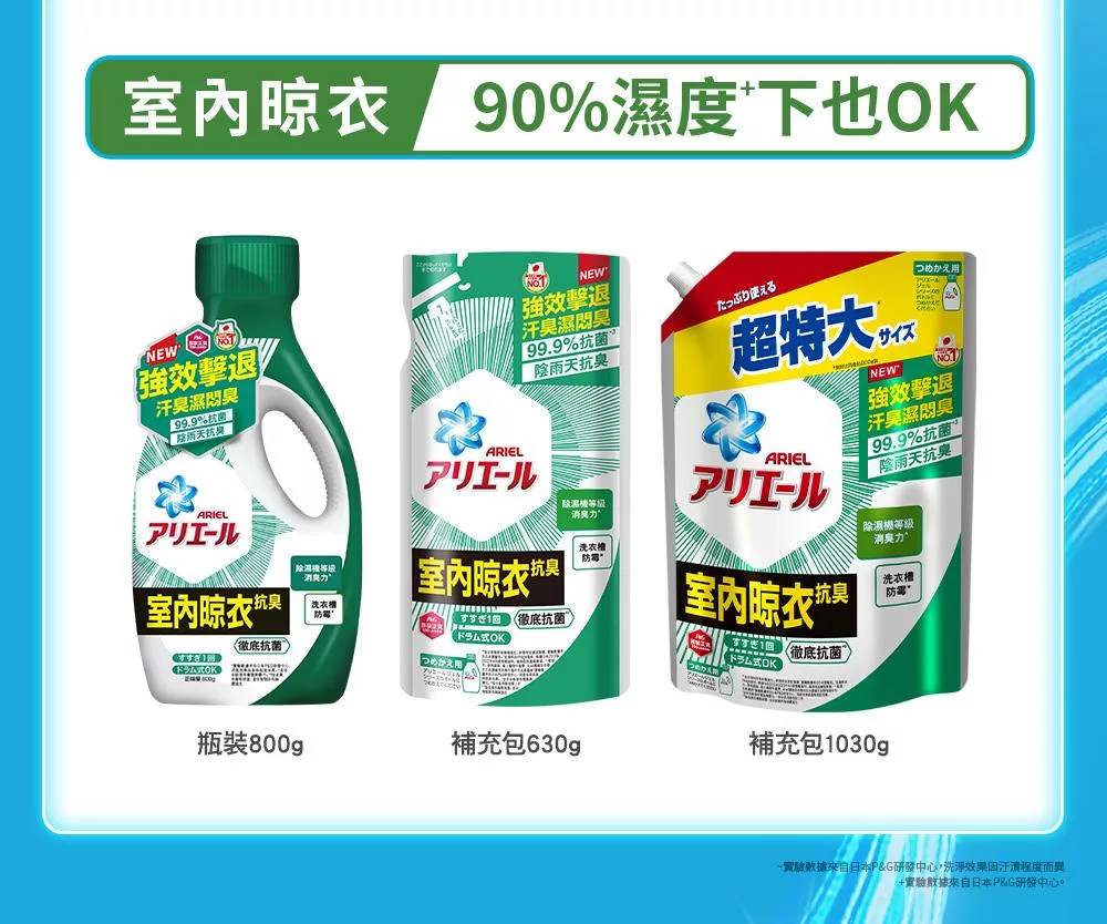 【日本ARIEL】抗菌抗臭洗衣精1030g補充包 (室內晾衣型)x8包