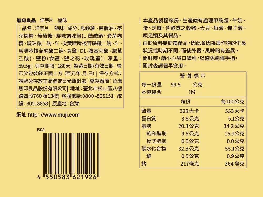 ●商品說明:馬鈴薯薄切油炸後以鹽簡單調味,風味自然,口感酥脆。
